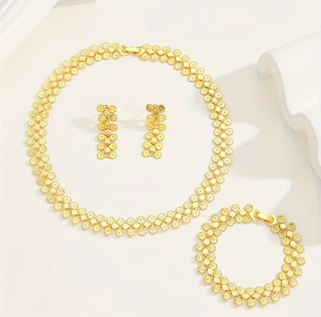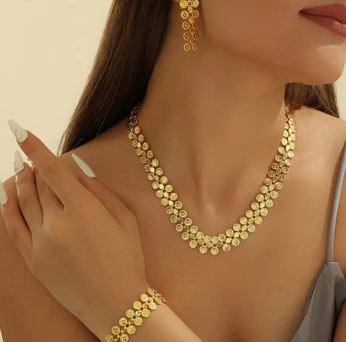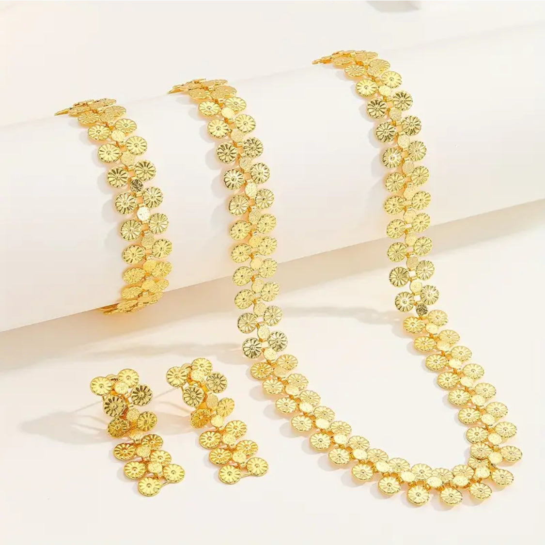 3pc pierced yellow gold circle necklace, bracelet and earring set