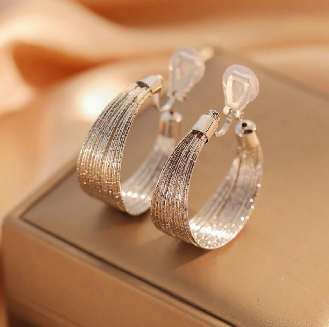 Clip on 1 1/2" sparkle silver wire graduated open back hoop earrings