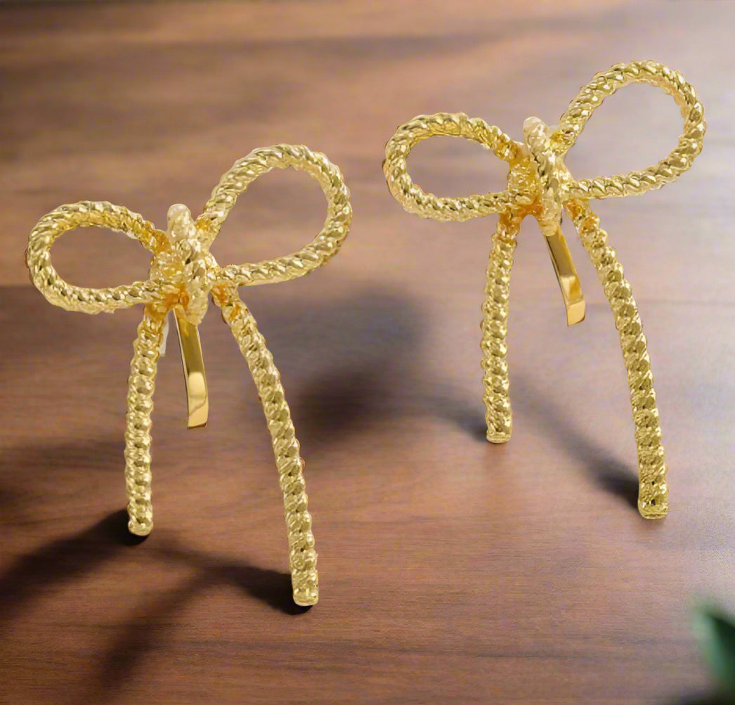 These 1 1/4" gold textured indented bow tie clip-on earrings add a touch of elegance without the need for piercings. Their unique textured finish creates subtle depth, making them perfect for elevating any outfit with a sophisticated yet playful flair. Lightweight and easy to wear, they offer comfort and style for all-day confidence.