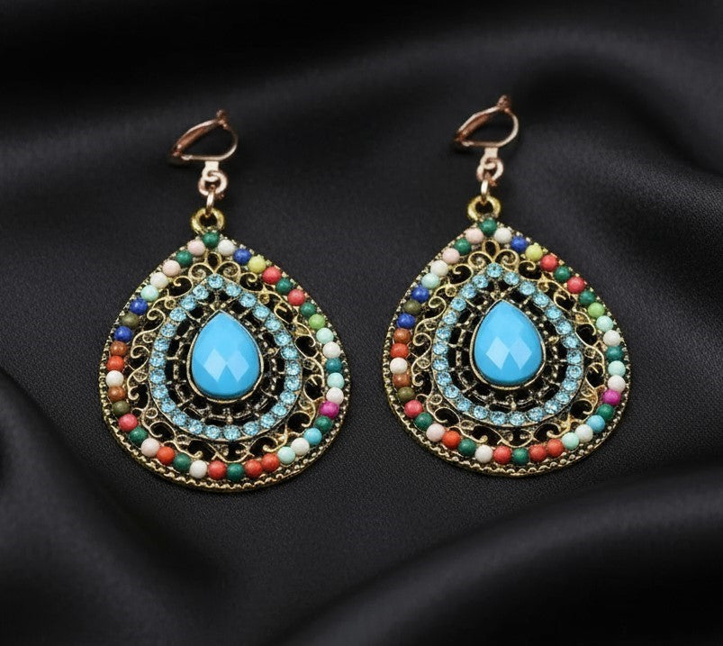 Clip on 1 3/4" gold and blue multi colored bead dangle teardrop earrings