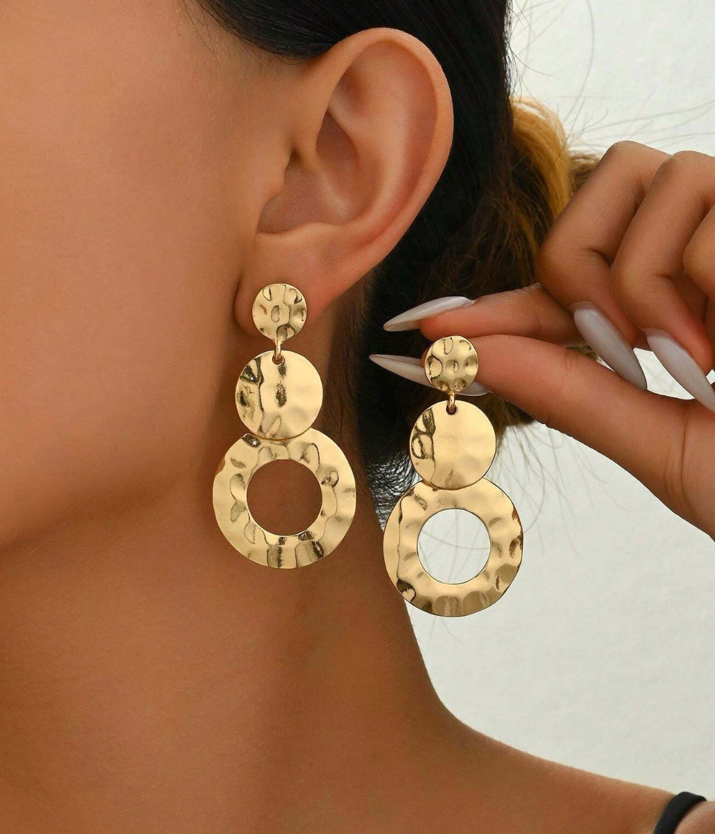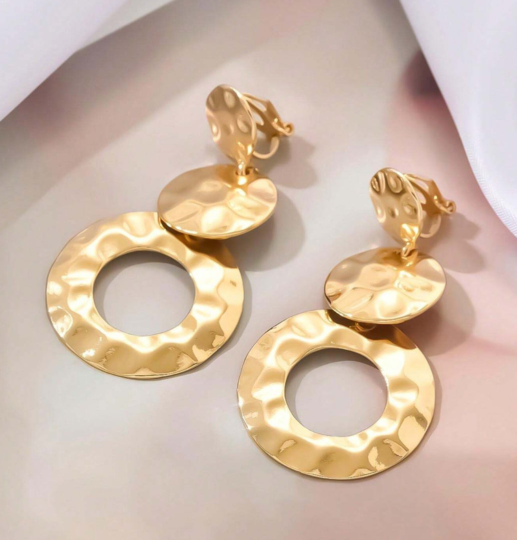 Elevate your style without the commitment of pierced ears. These stunning 2 1/4" clip-on hoops feature a luxurious hammered gold finish that catches the light with every movement. The sophisticated dangle design adds drama to any outfit, while the secure clip mechanism ensures comfortable all-day wear. Perfect for special occasions or adding a touch of glamour to your everyday look.