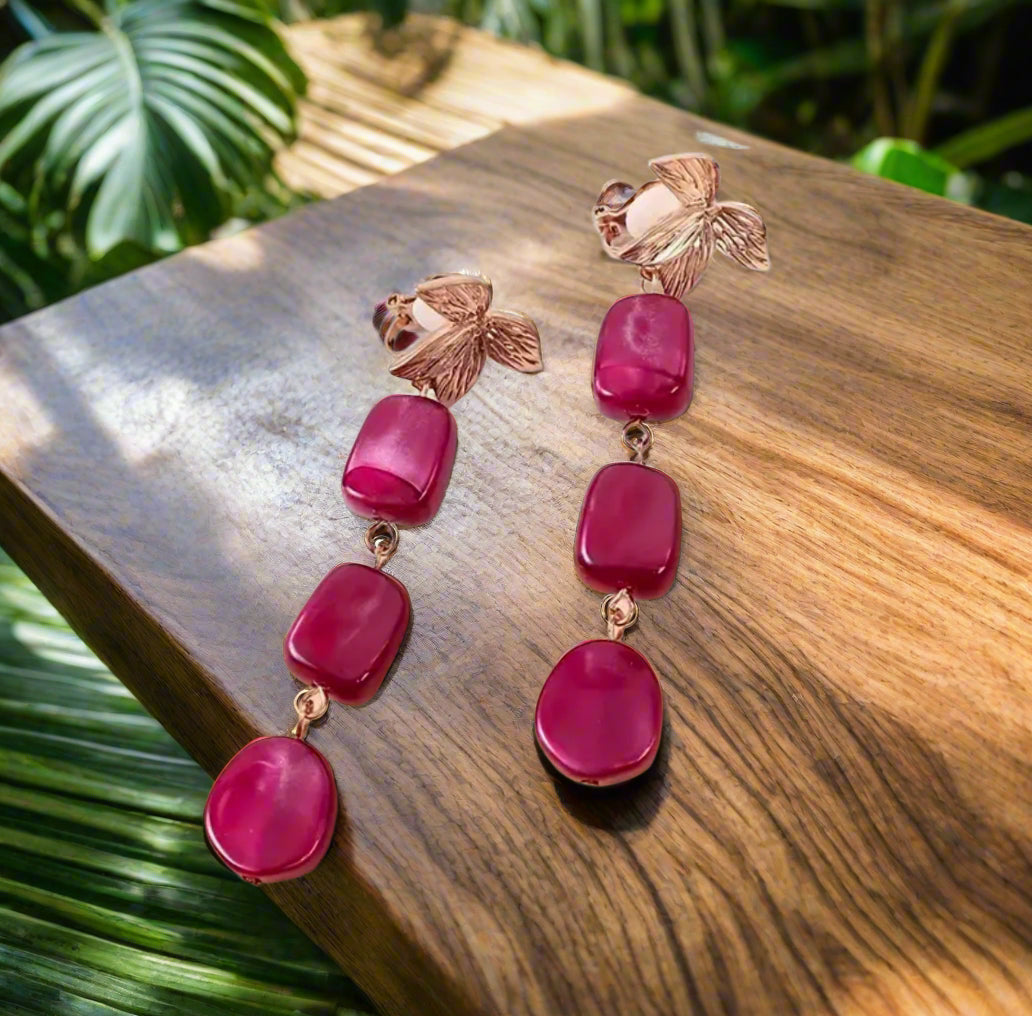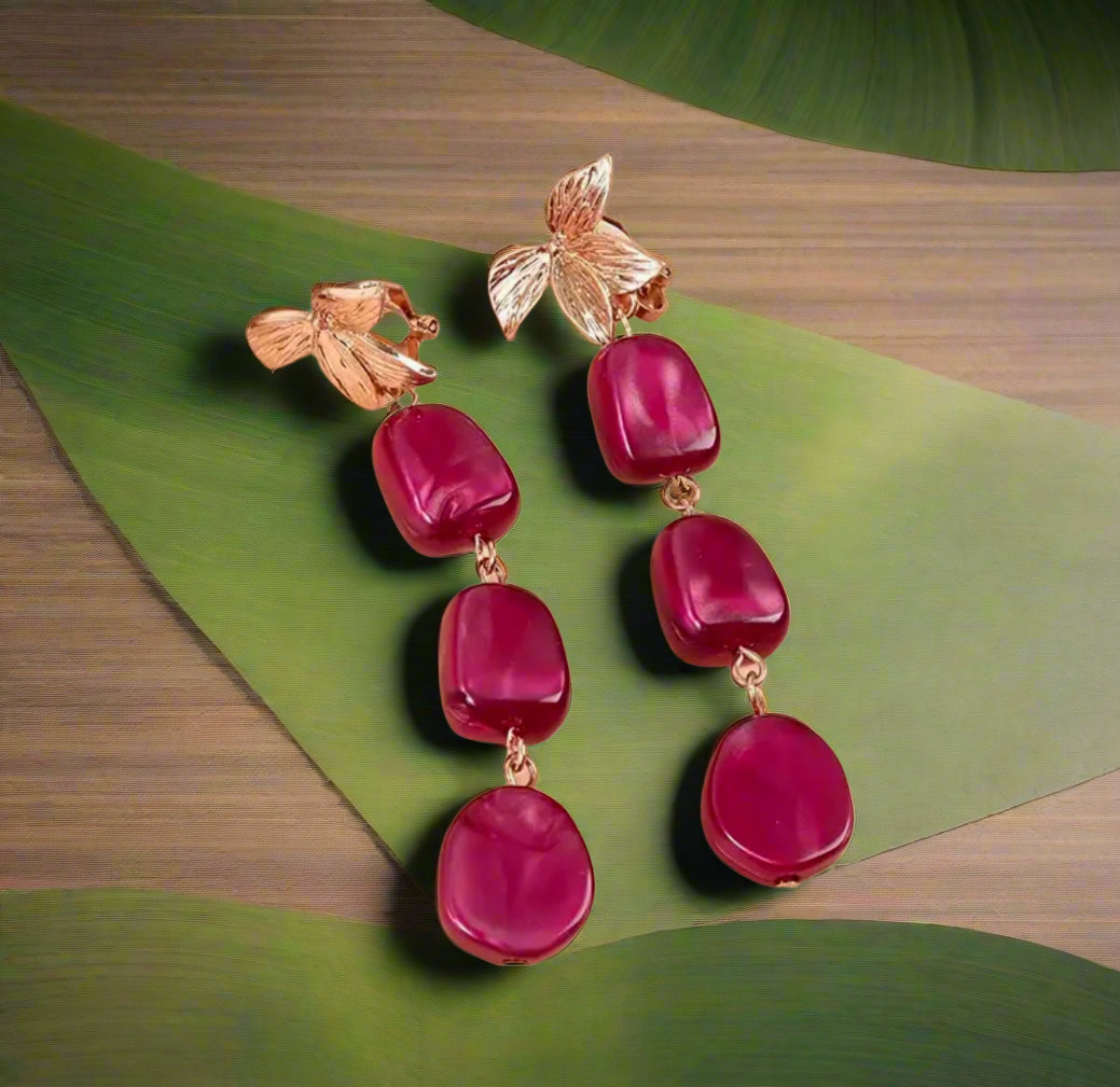 Elevate your style with these 2 3/4" clip-on earrings featuring delicate gold leaf accents paired with unique pink dangle beads. Designed for comfort without pierced ears, they offer a bold, fashionable statement perfect for any occasion. Add a touch of elegance and playful charm effortlessly.
