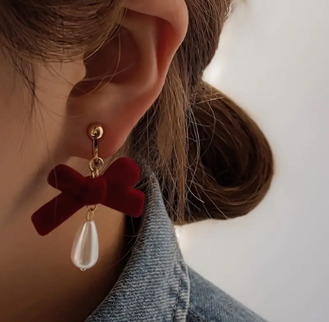 Elevate your style with these elegant 2" clip-on earrings featuring a luxurious red velvet bow accented by shimmering gold details. A delicate pearl dangle adds a touch of timeless sophistication, making them perfect for both special occasions and everyday grace. Comfortable and easy to wear, these earrings offer a chic statement without the need for pierced ears.