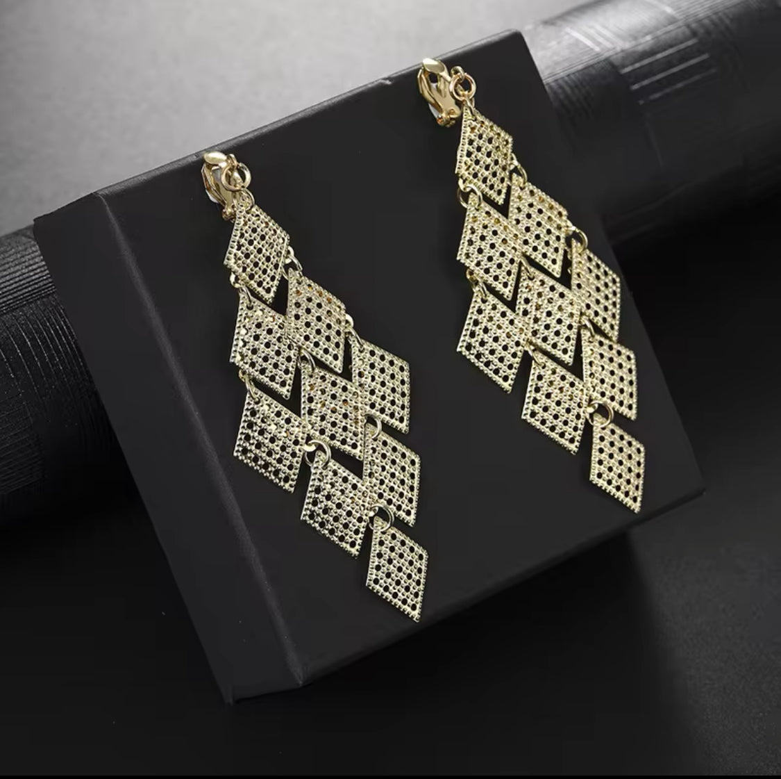 Clip on 3 1/2" gold pinhole layered square dangle earrings