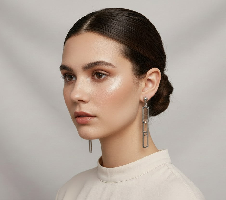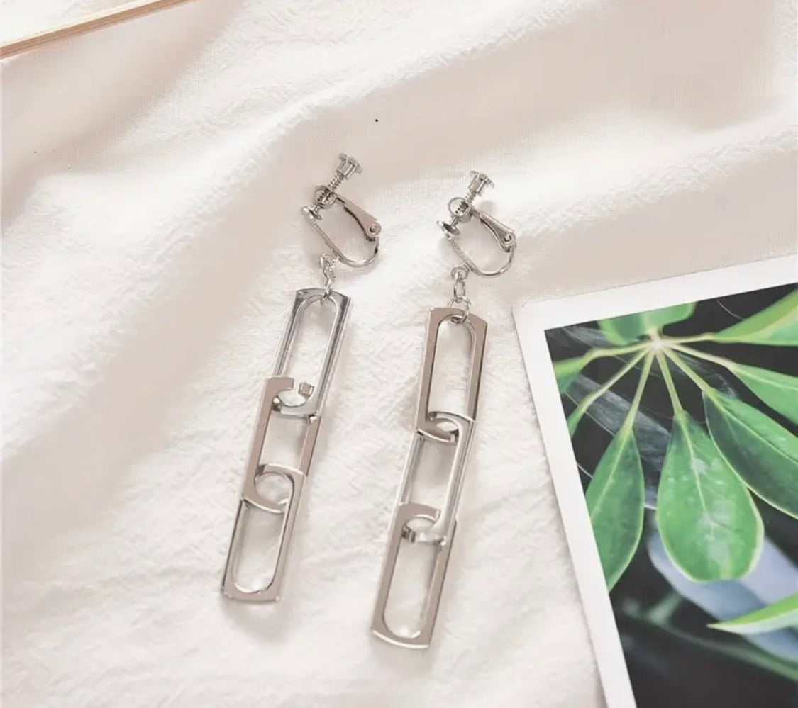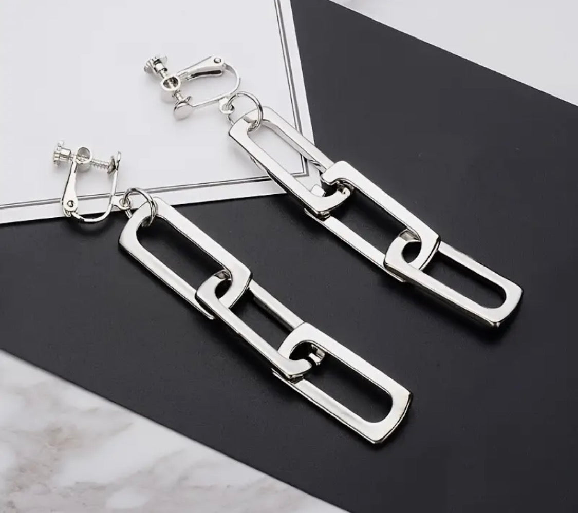 Make a statement with these striking screw-back clip-on dangle earrings featuring a sleek silver square link chain design. At 3 1/4" long, they offer the perfect balance of presence and wearability, catching light beautifully with every movement. The secure clip-on mechanism ensures all-day comfort without piercing, making them ideal for sensitive ears or those who prefer versatile styling options.