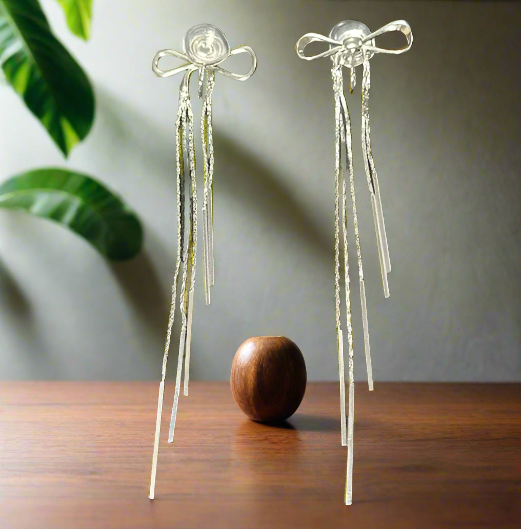 Make a statement with these 3 3/4" extra-long clip-on silver bow dangle chain earrings. Designed with a secure spring-back mechanism, they offer comfortable wear without pierced ears. The elegant bow and flowing chains create a graceful, eye-catching movement, perfect for enhancing any outfit with a touch of sophistication and flair. These earrings combine style and ease for a standout accessory you’ll love to wear.