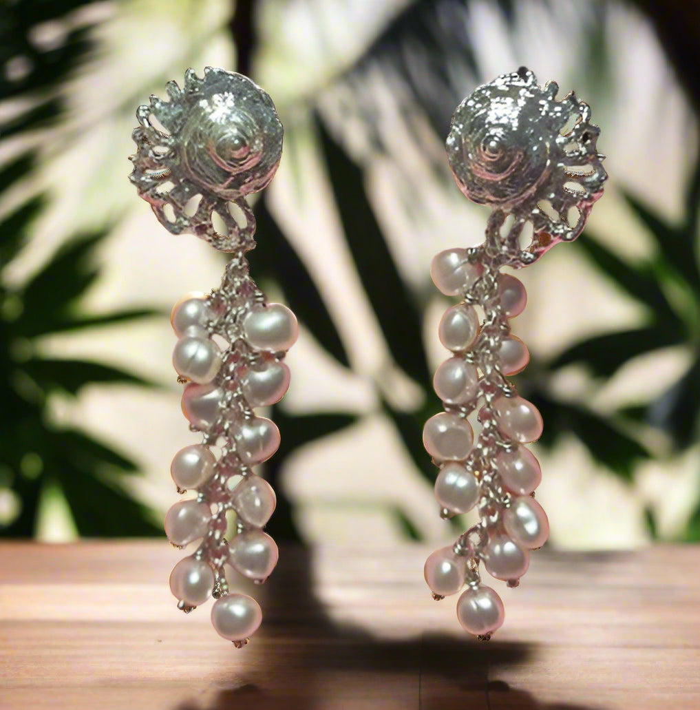 Clip on 3" long silver shell dangle layered white pearl chain earrings
