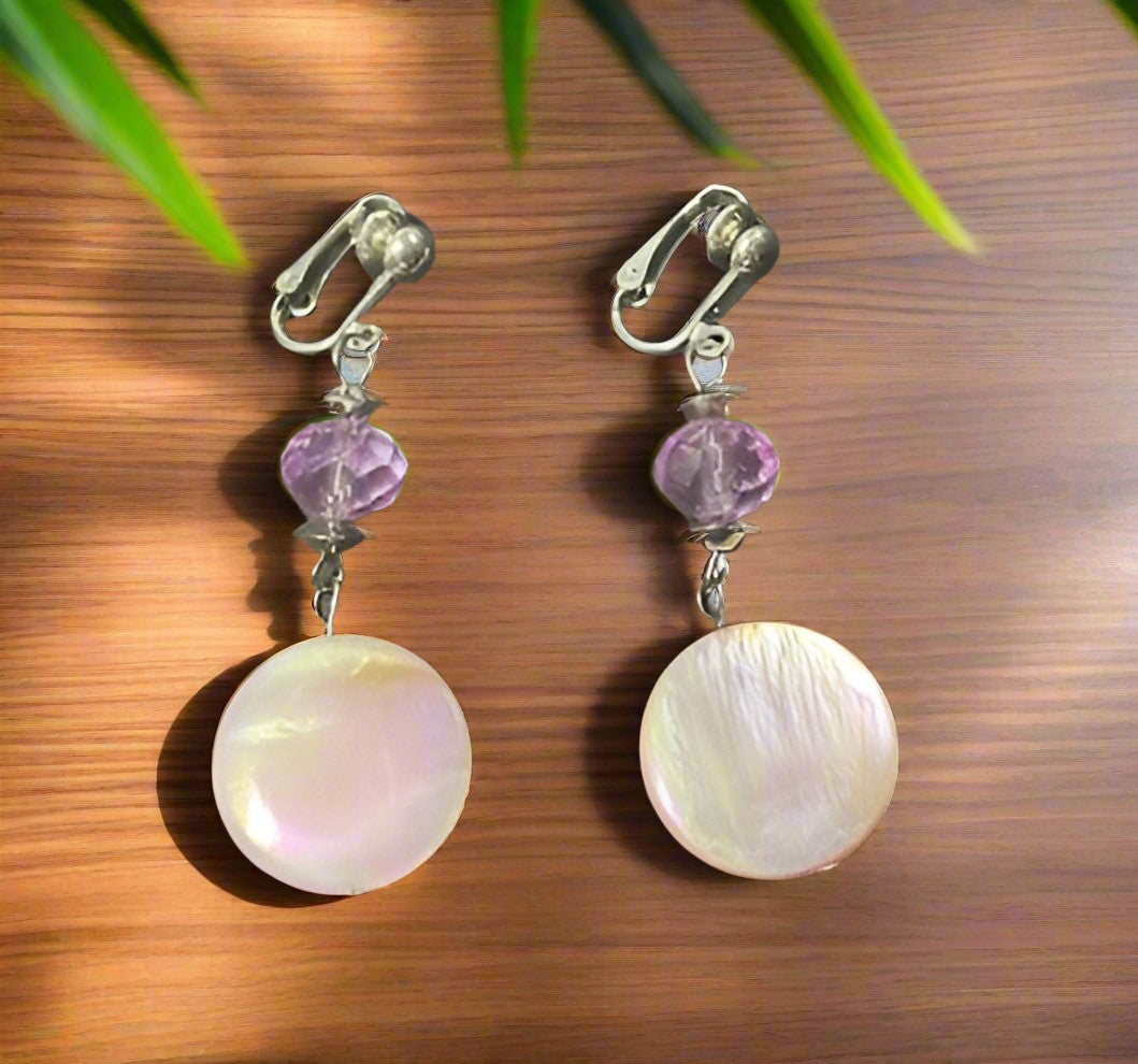 Add a touch of elegance and playfulness to your look with these 2 1/4" clip on earrings. The combination of silver and purple beads, along with the iridescent dangle shell, creates a unique and eye-catching piece. No piercings needed, making them the perfect accessory for anyone.