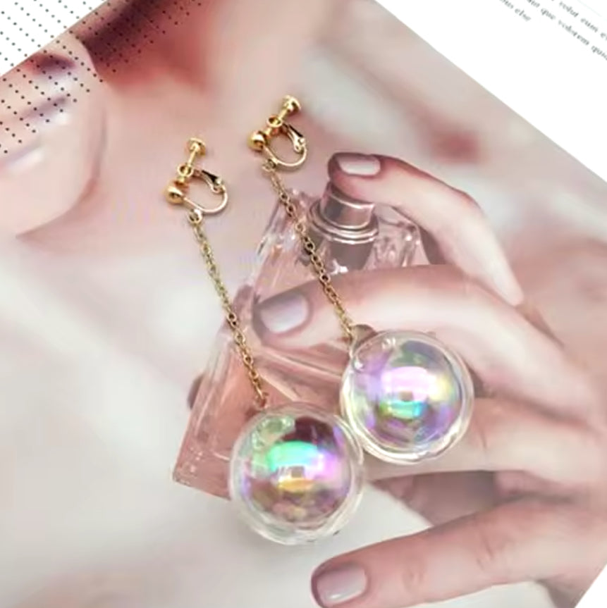 Make a striking statement with these 3 3/4" long clip-on earrings featuring gold chain and iridescent dangle balls filled with water and clear stone top. Their unique design catches light beautifully, creating mesmerizing movement and shimmer with every wear.