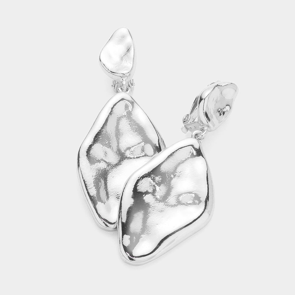 Make a bold statement with these 3" large shiny silver bent dangle earrings, designed for clip-on comfort. Their eye-catching shimmer and elegant curves add a touch of sophistication to any outfit without the need for pierced ears. Perfect for elevating your style effortlessly while ensuring all-day wearability.