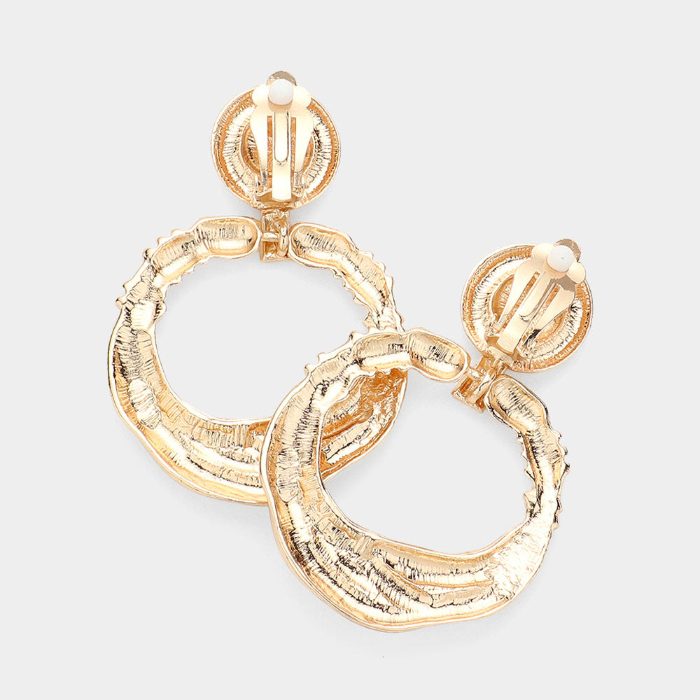 Make a bold statement with these 2 3/4" extra-large clip-on door knob hoop earrings featuring a striking gold rope print and indented texture. Their dangle design adds movement and elegance without the need for pierced ears, perfect for those seeking style and comfort. Elevate any outfit with these eye-catching, easy-to-wear accessories that combine classic charm with a modern twist.