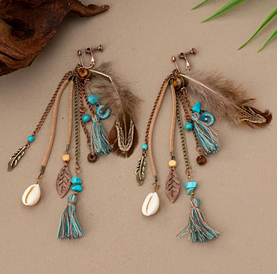 These 5 1/2" extra long screwback clip-on earrings feature a striking combination of copper and turquoise stone, designed to dangle gracefully with feather, shell, leaf, wood bead, and string accents. Perfect for adding a bold, bohemian touch without the need for piercings, they offer both style and comfort for any occasion. Elevate your look effortlessly with these eye-catching accessories.