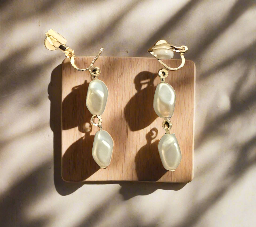 Clip on 1 1/2" gold and white hammered dangle pearl earrings