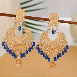 Elevate your style with these Bohemian 3 3/4" pierced dangle earrings, featuring a stunning combination of gold and vibrant blue beads. Their lightweight design ensures comfortable wear all day, while the eye-catching colors add a unique, artistic touch to any outfit. Perfect for expressing your free-spirited vibe with elegance and flair.