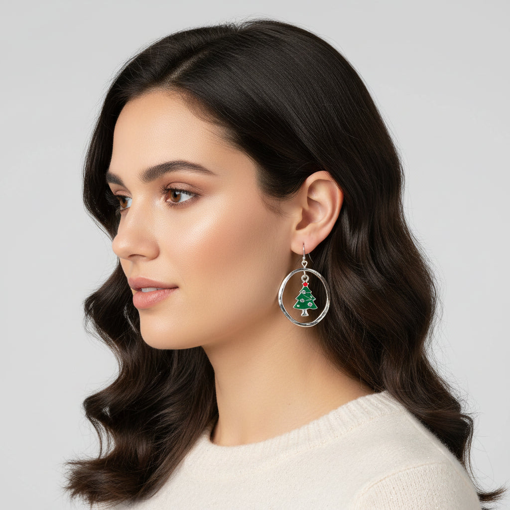 Enhance your holiday style with these 1 3/4" silver hammered hoop earrings featuring a charming dangle of a green Christmas tree adorned with red star accents and glowing fluorescent stones. Crafted to be lead compliant, they offer festive sparkle while prioritizing your safety. Perfect for adding a touch of seasonal cheer to any outfit.