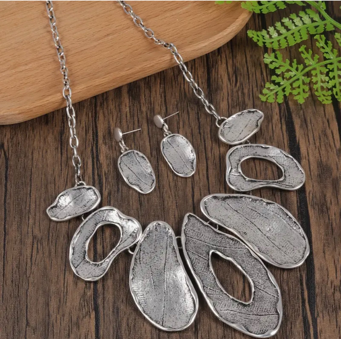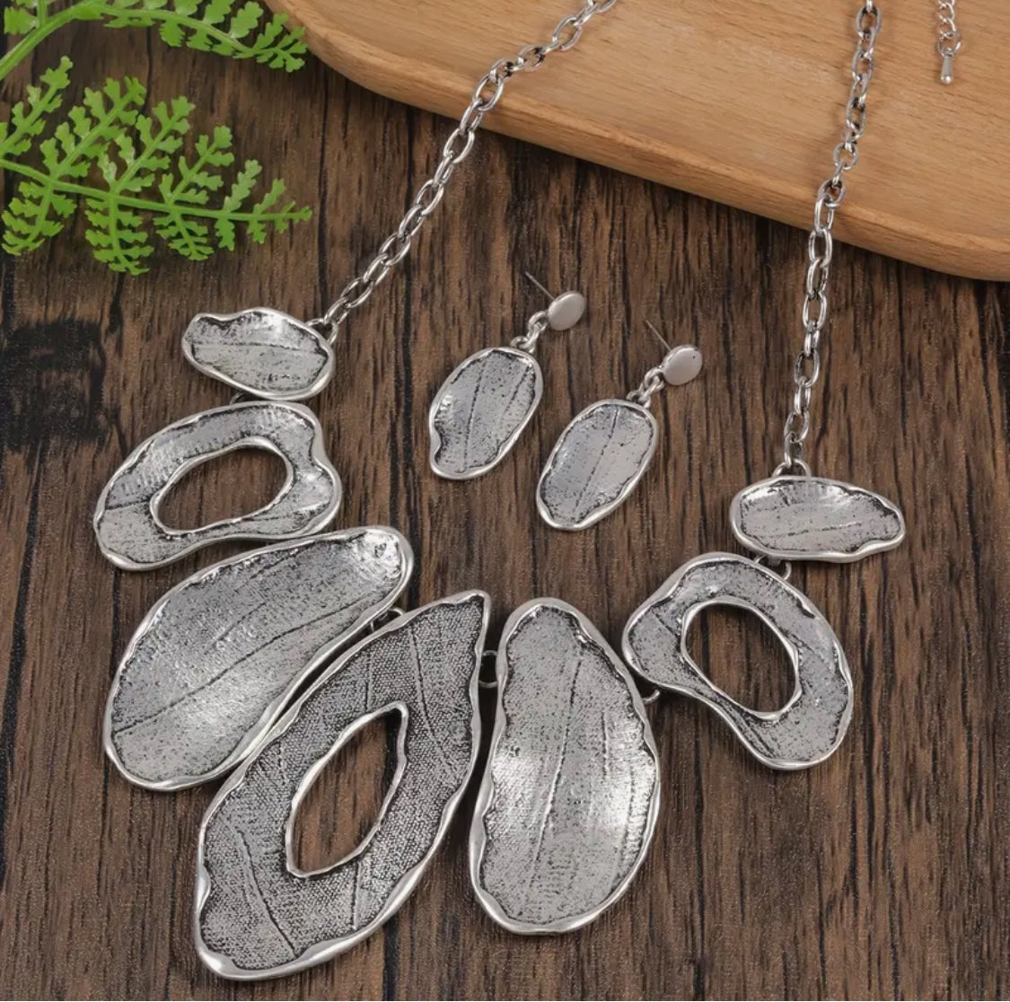 Pierced matte silver odd shaped necklace and earring set