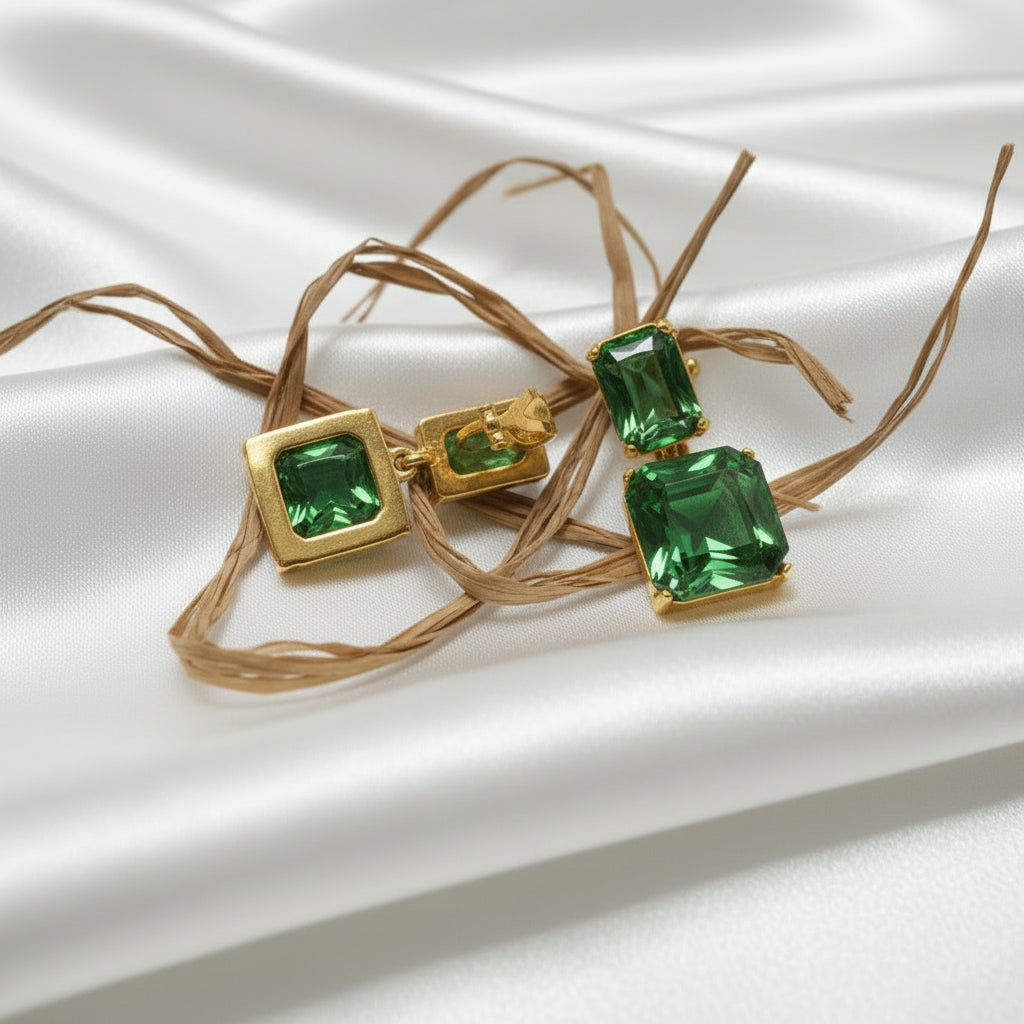 Elevate your accessory collection with these striking clip-on earrings, featuring dual square-cut green stones set in lustrous gold. At 1 1/2" in length, they deliver a bold yet refined presence that complements both contemporary and classic wardrobes. The dangle design creates graceful movement with every turn of the head, while the clip-on mechanism ensures secure, comfortable wear without piercing.
