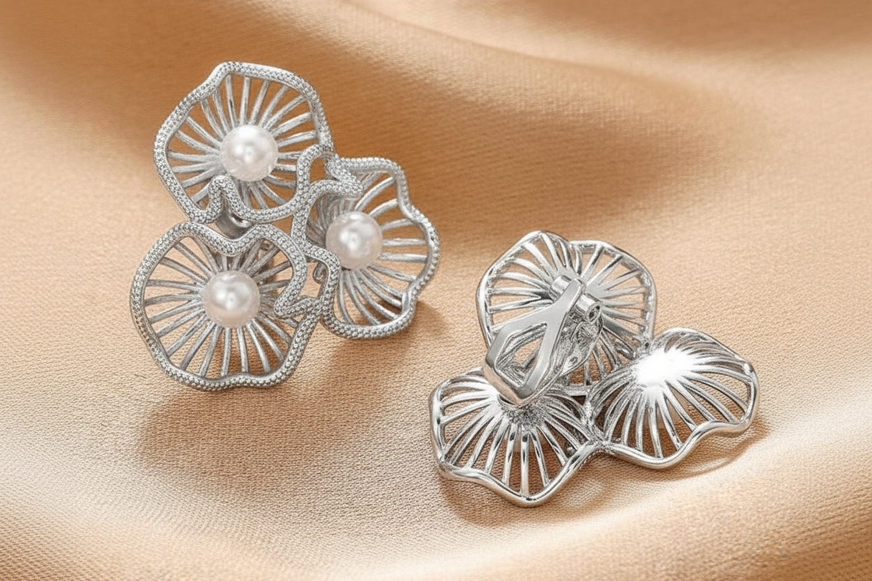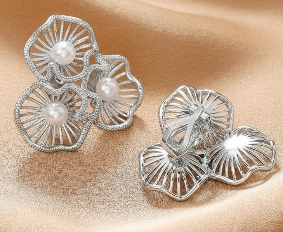 Elegant clip-on earrings featuring a delicate silver flower cluster design paired with lustrous white pearl accents. These 1 1/4" statement pieces offer a sophisticated button-style silhouette perfect for adding a touch of refined glamour to any occasion. The secure clip mechanism ensures comfortable, all-day wear without piercing. Ideal for those seeking timeless jewelry that transitions effortlessly from casual to formal settings.