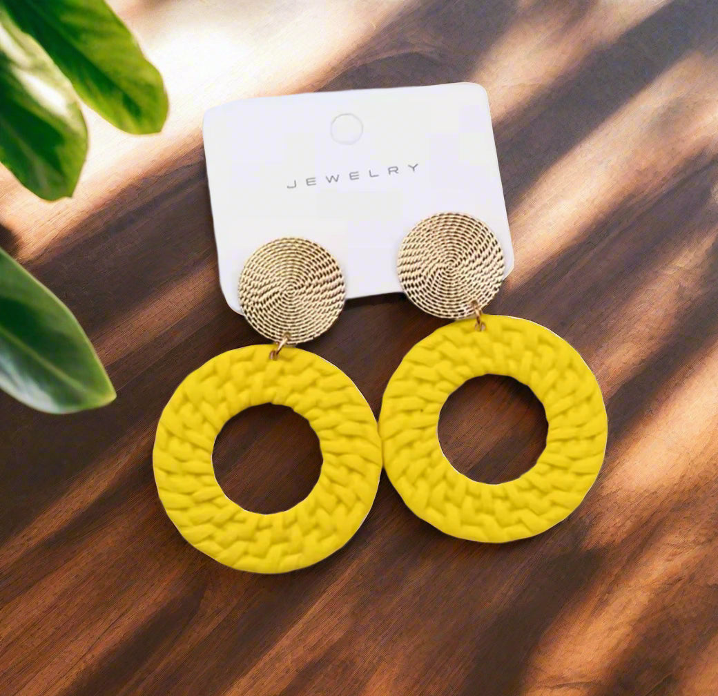 Clip on 2 1/2" round gold top earrings with dangle yellow woven hoop