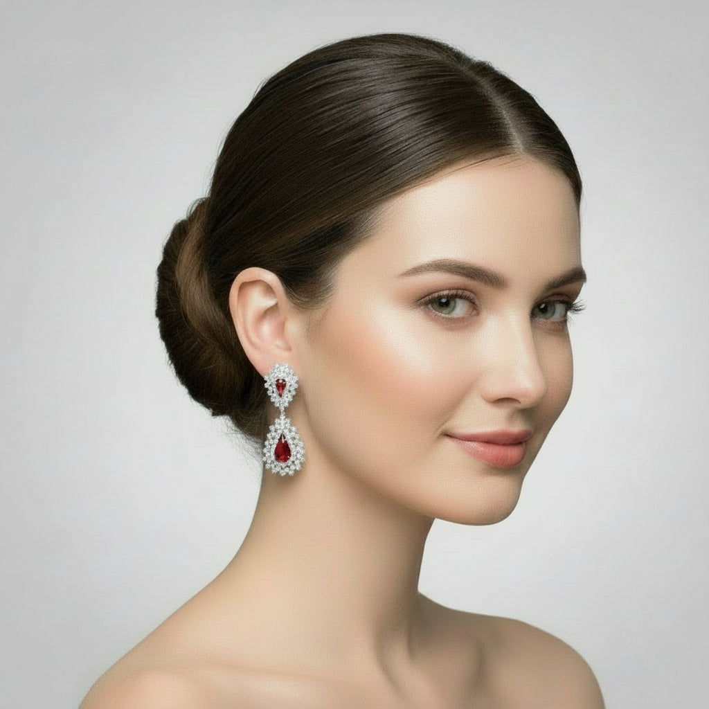 Elevate your holiday look with these stunning clip-on earrings featuring elegant double teardrop designs in shimmering silver with vibrant red and crystal accents. Measuring 2 1/4" long, these eye-catching dangles deliver sophisticated style without the commitment of pierced ears. Perfect for festive celebrations, special occasions, or whenever you want to make a statement. Lead-compliant construction ensures safe, worry-free wear.