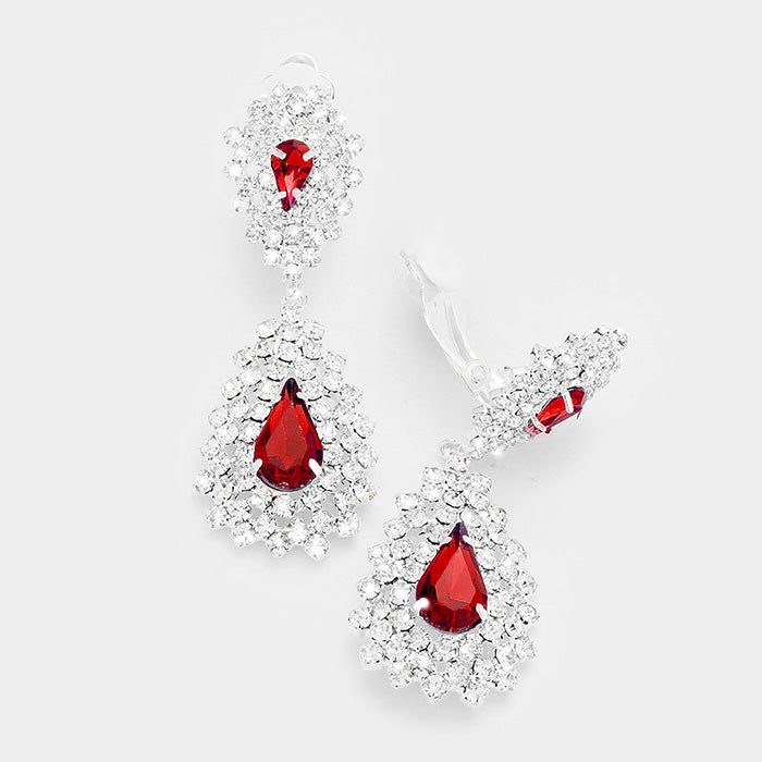 Clip on 2 1/4" silver clear and red double teardrop dangle earrings