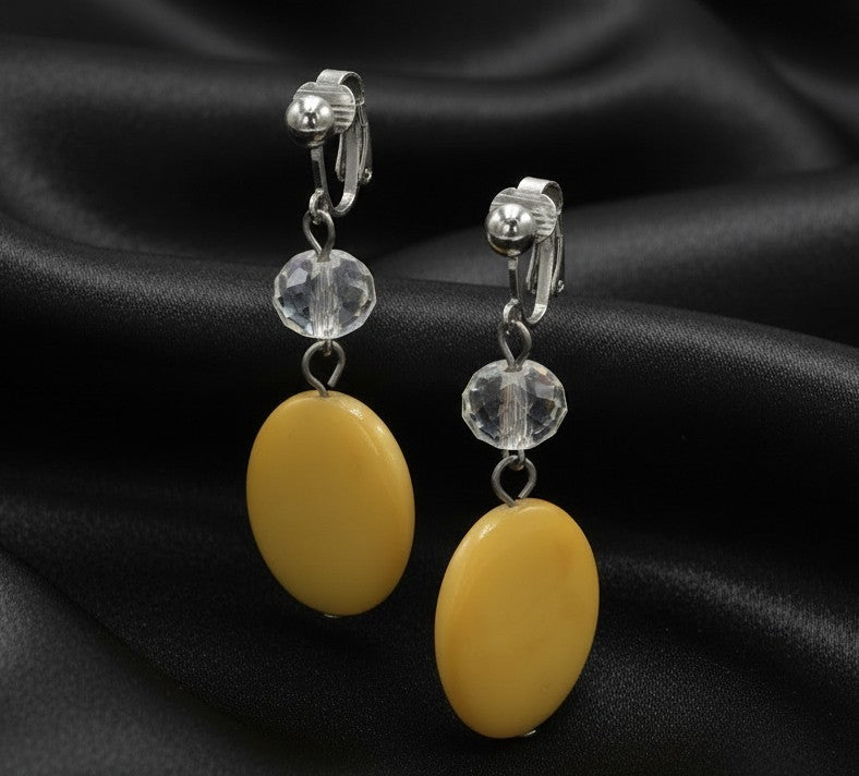 Clip on 2 1/4" silver, clear and yellow bead dangle earrings