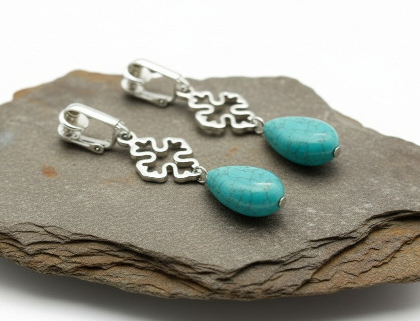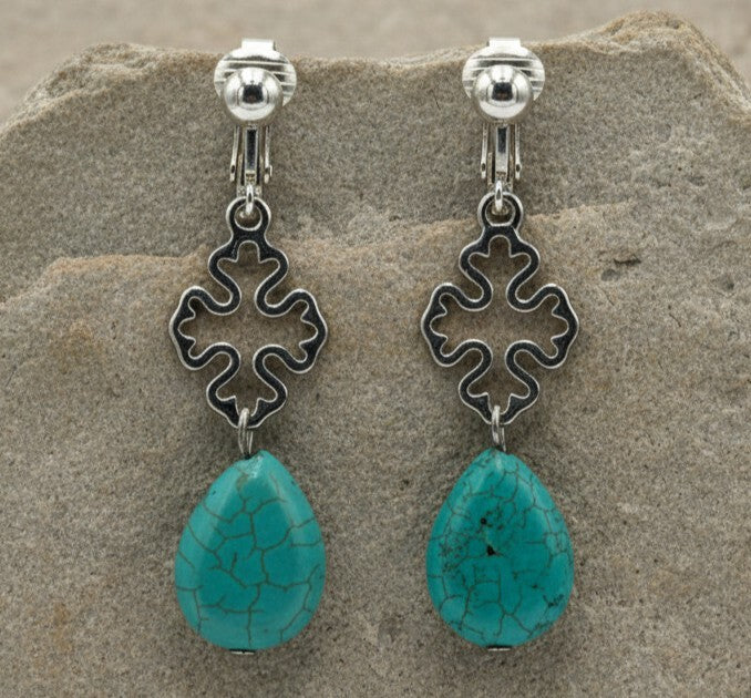 Bring timeless elegance to your collection with these charming clip-on earrings. At 2" long, they showcase delicate silver cutout flowers adorned with a striking turquoise bead accent. The intricate floral design paired with the pop of color creates a sophisticated yet playful aesthetic that works for any occasion. These clip-on earrings offer comfort and convenience without the need for piercings, making them ideal for sensitive ears or anyone seeking versatile, easy-to-wear jewelry.