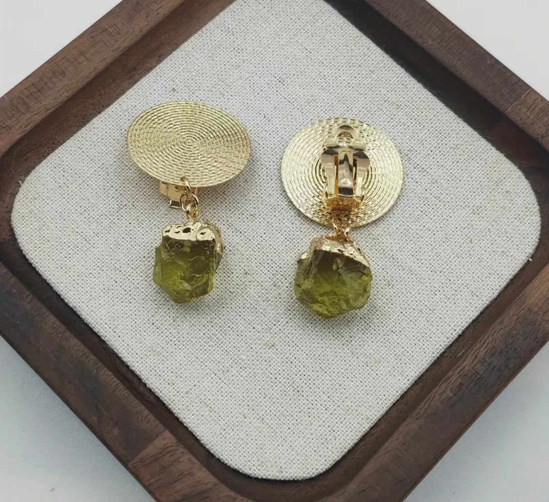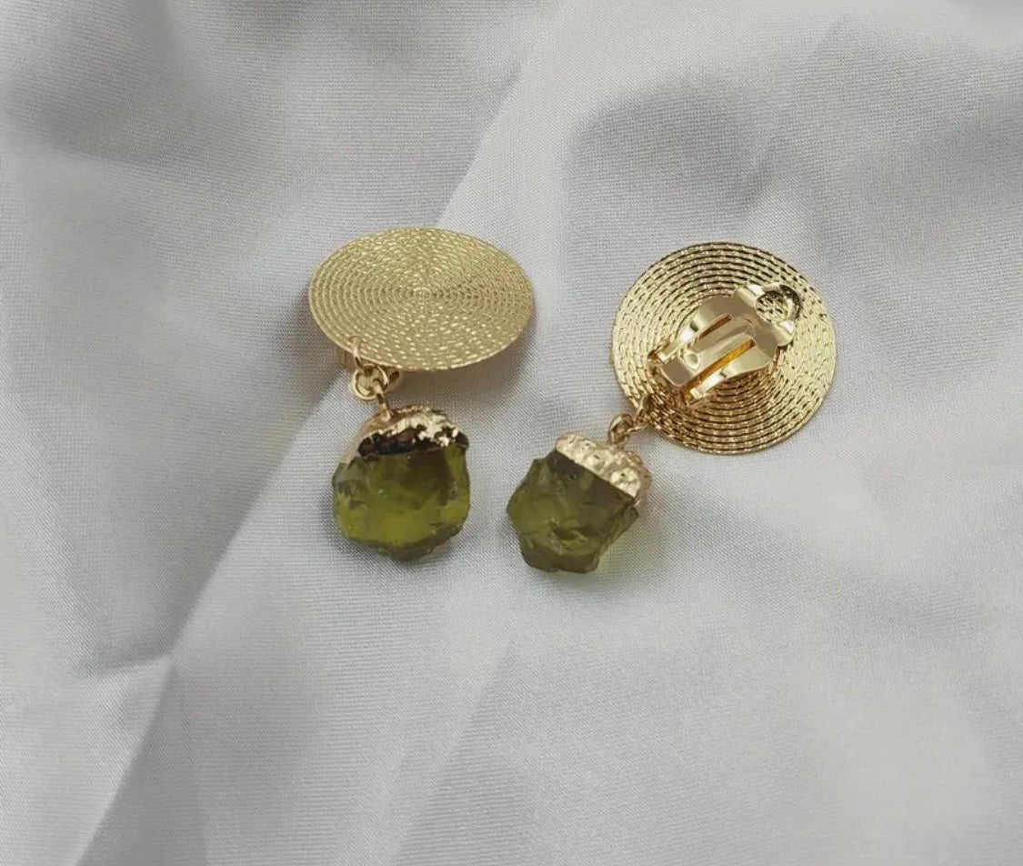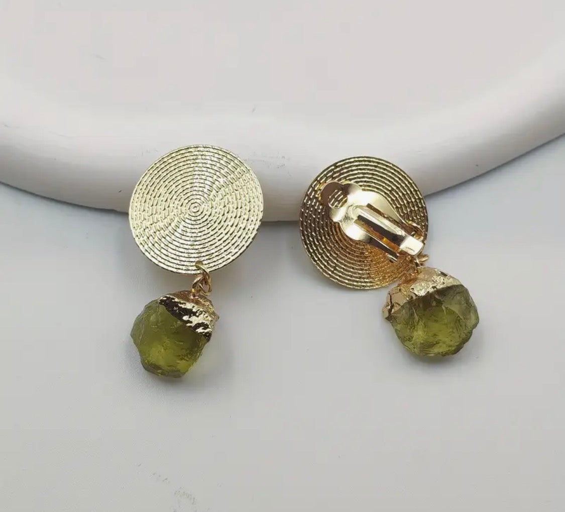 Make a statement with these stunning clip-on earrings that combine timeless elegance with modern flair. Featuring a lustrous 2-inch gold round design with intricate texturing, each earring showcases a captivating dangling green rock-style bead that catches the light beautifully.