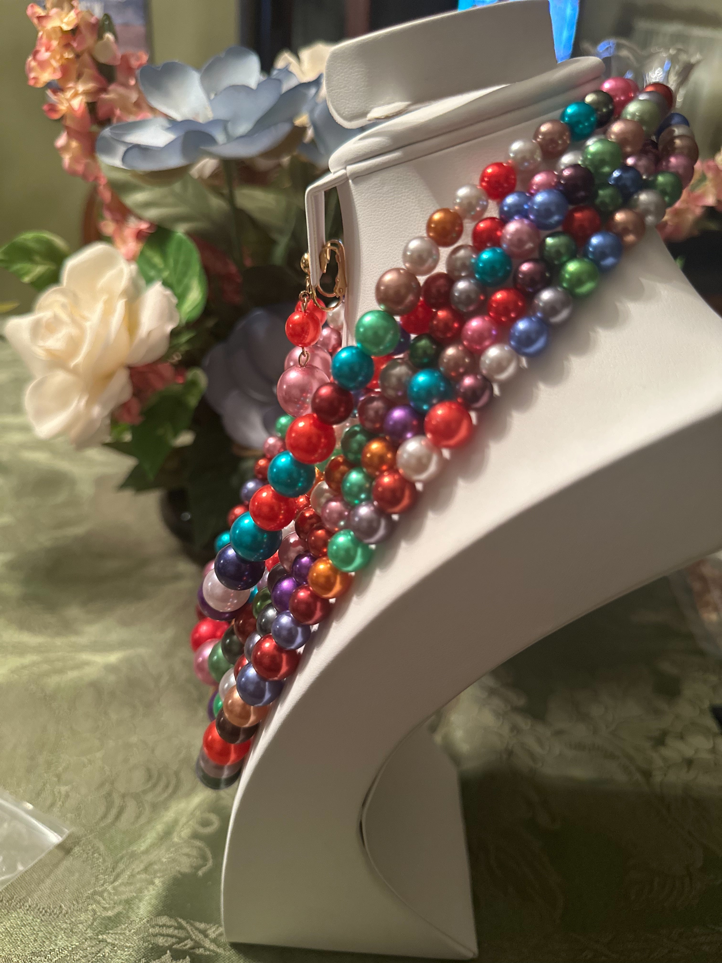 Make a bold statement with this captivating clip-on necklace set, blending cool silver tones with rich burgundy, blue, gray, red, green, burgundy, and purple hues accented by lustrous pearl beads. The multi-strand design delivers sophisticated layering options—wear all strands together for dramatic flair or mix and match for personalized styling.