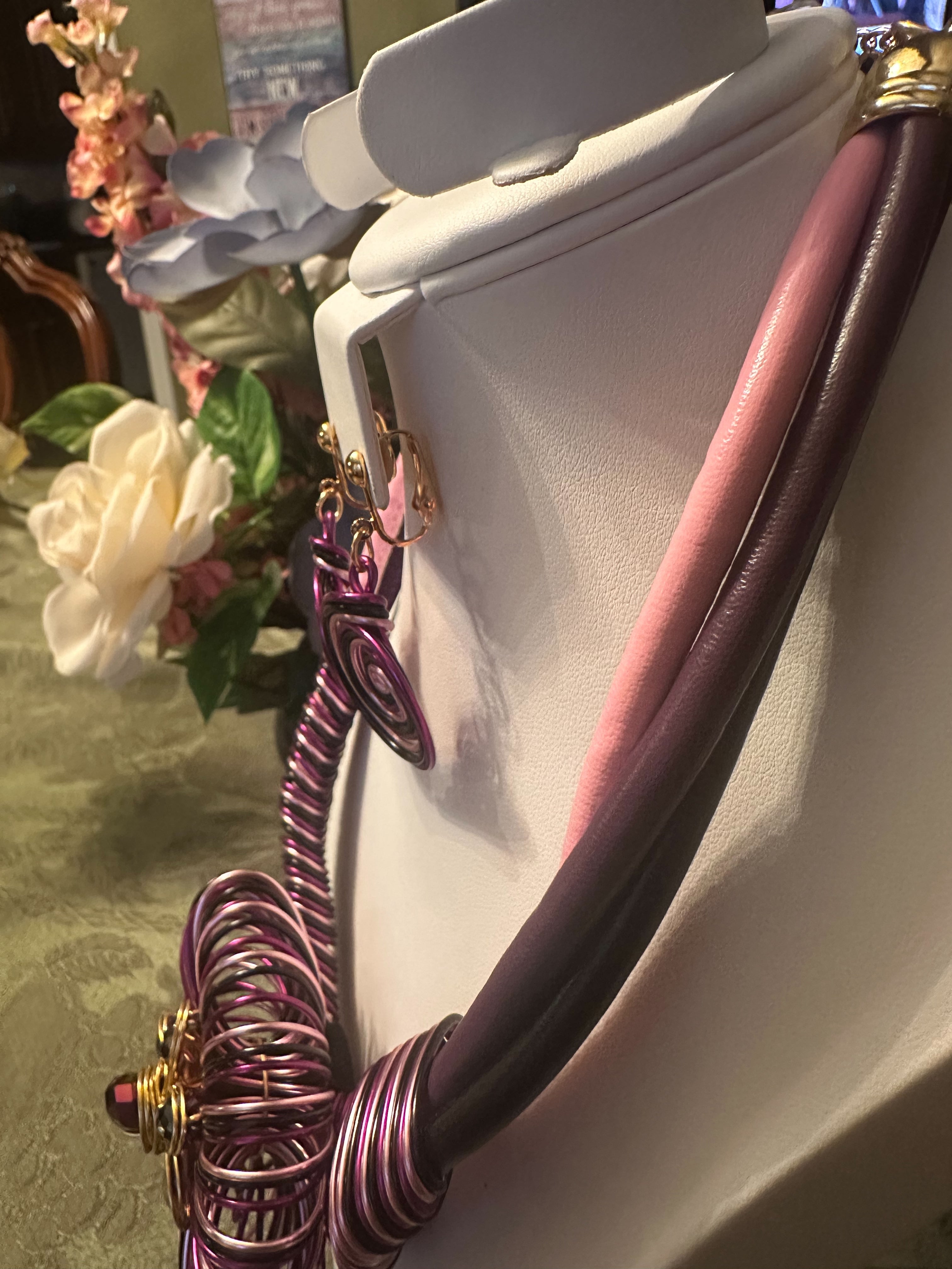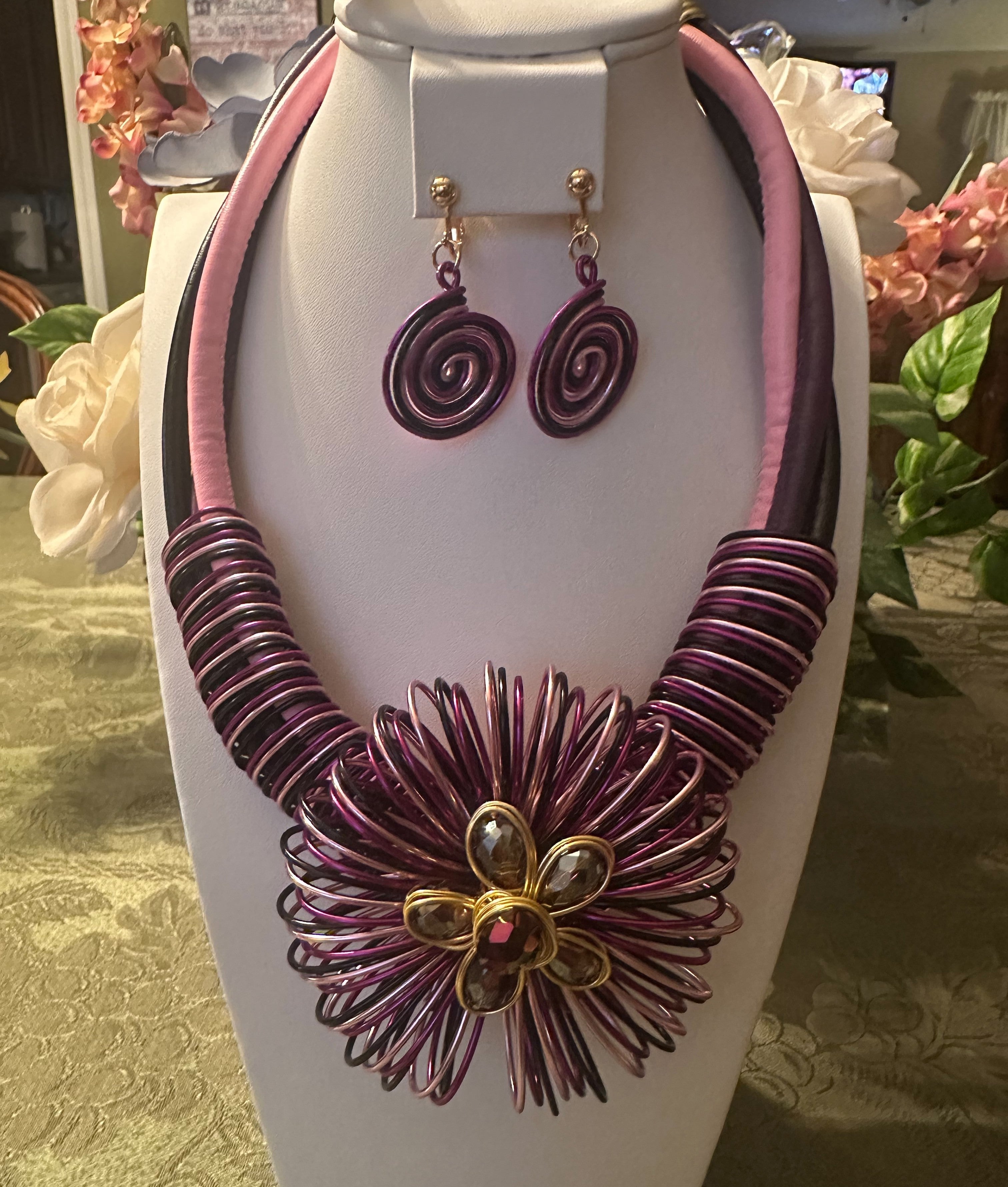 Elevate your accessory collection with this sophisticated clip-on set featuring pink, purple, black, piping and delicate wire-wrapped flowers with complementary gold, pink, purple and blue stones. The matching necklace and earring combination offers versatile styling for both everyday elegance and special occasions. Crafted with precision, the wire flower design creates an artisanal aesthetic while the clip-on earrings ensure comfortable, all-day wear without piercing.