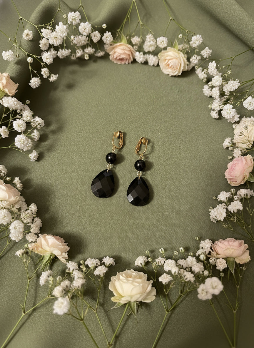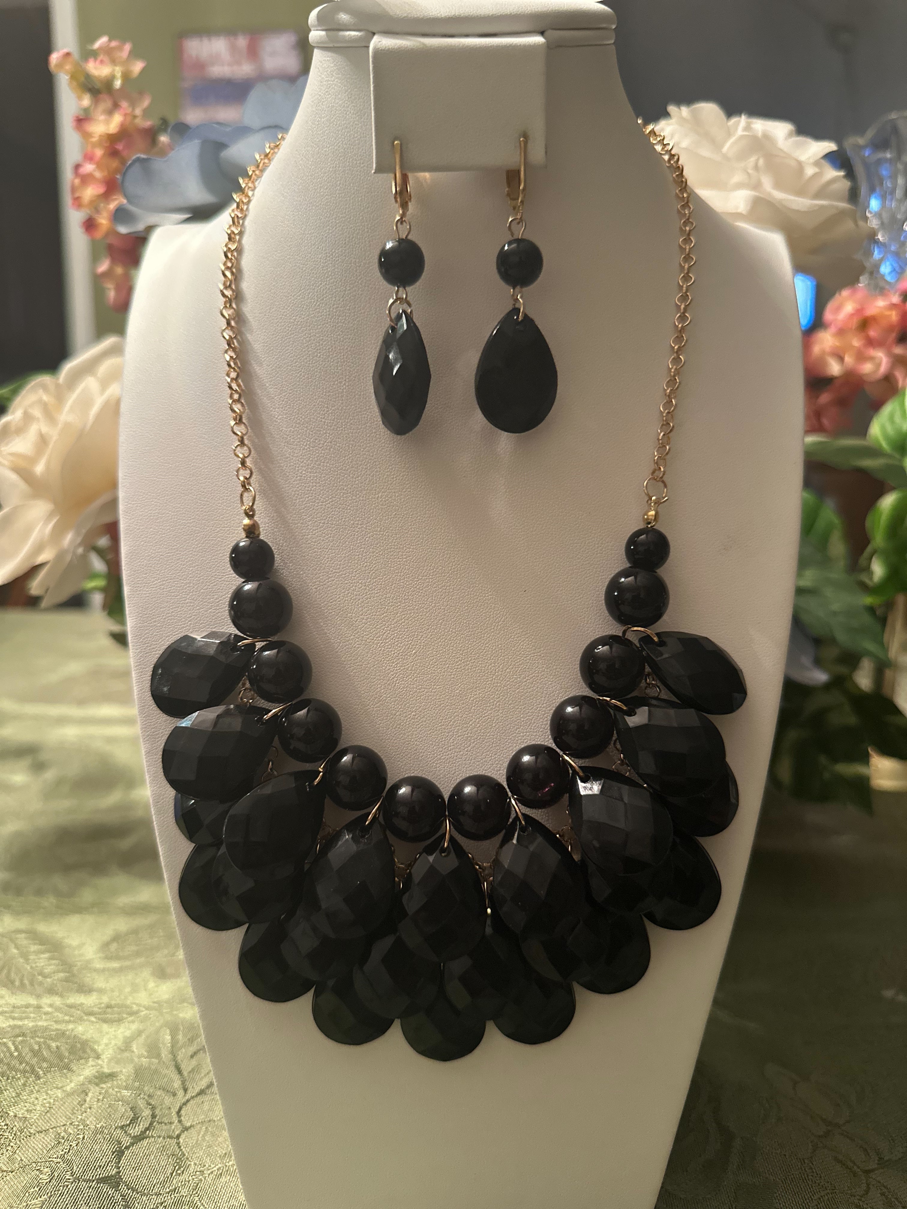 Add a touch of elegance to your outfit with our Clip on Gold chain and black teardrop bead necklace and Earring Set! The stunning gold and black colors will make you stand out, while the clip-on design ensures comfort and versatility. Elevate your style with this must-have accessory.