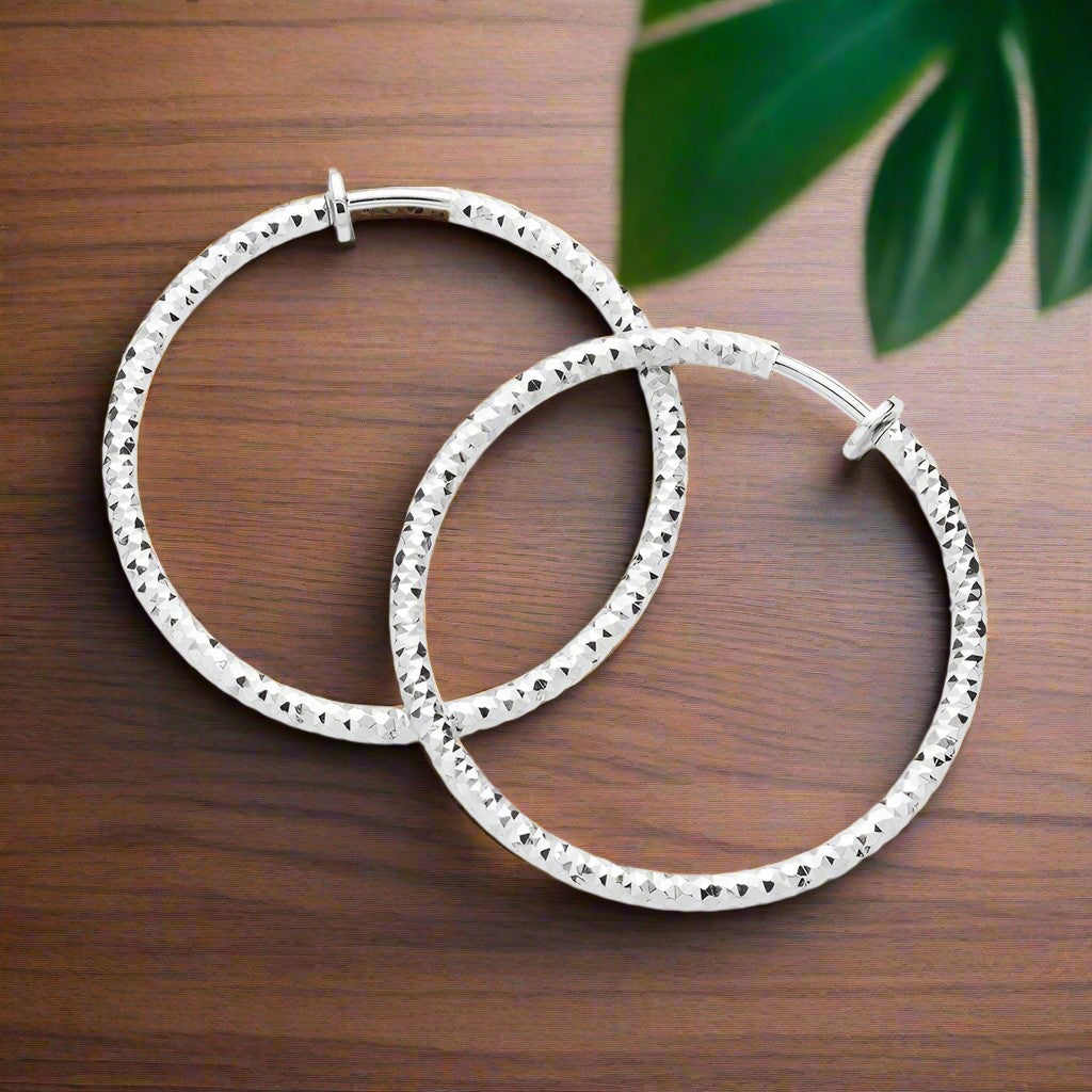 Clip on 1 3/4" silver textured spring back hoop earrings