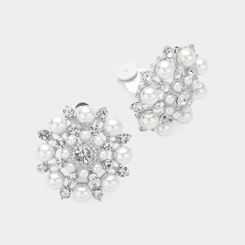 Make a statement with these vintage 1 1/2" large clip-on earrings, featuring a silver round cutout design accented by luminous white pearls and sparkling clear stones. Their classic elegance combines timeless charm with easy, comfortable wear—perfect for adding a touch of sophistication to any outfit without needing pierced ears.