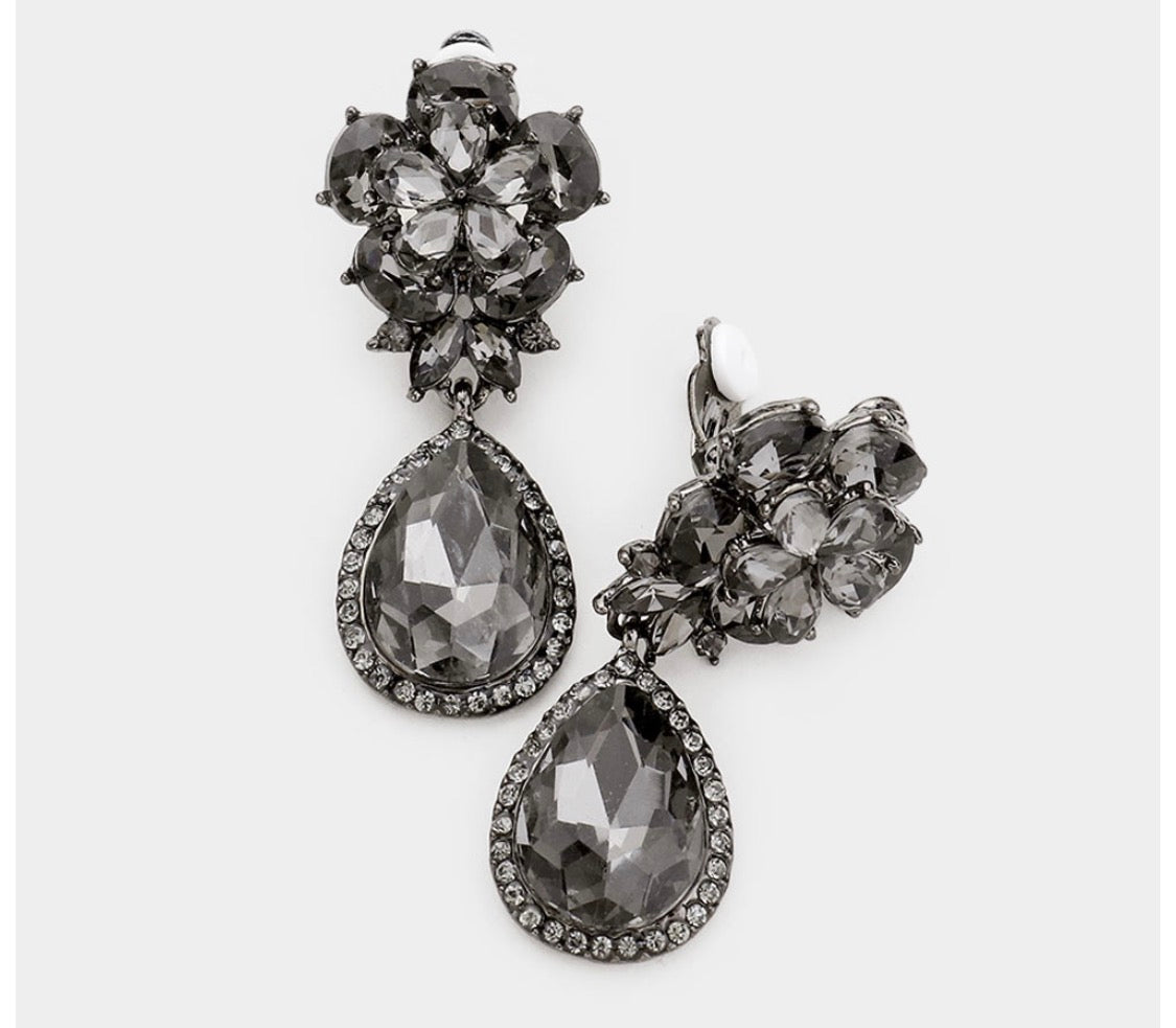 Classy 2" clip on silver, gray stone flower and teardrop earrings
