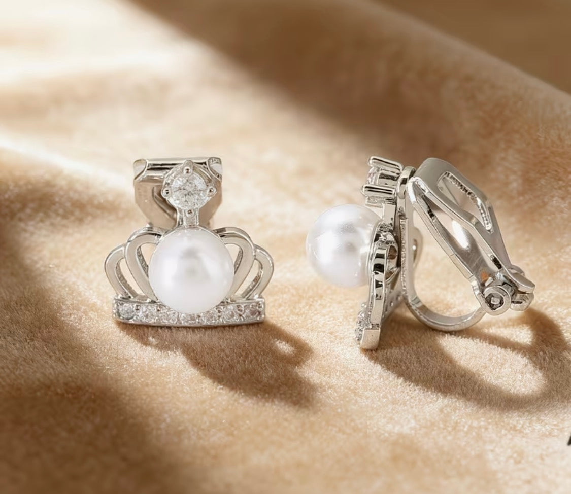 Elevate your elegance with these stunning clip-on crown earrings, featuring lustrous pearl centers accented by sparkling clear stones in a timeless silver setting. At just 1/2" in size, they're perfectly proportioned for everyday wear or special occasions. The secure clip-on design ensures comfortable, all-day wear without piercing, making them ideal for sensitive ears or those seeking versatile styling options.