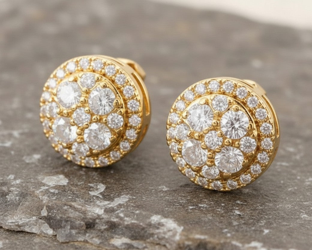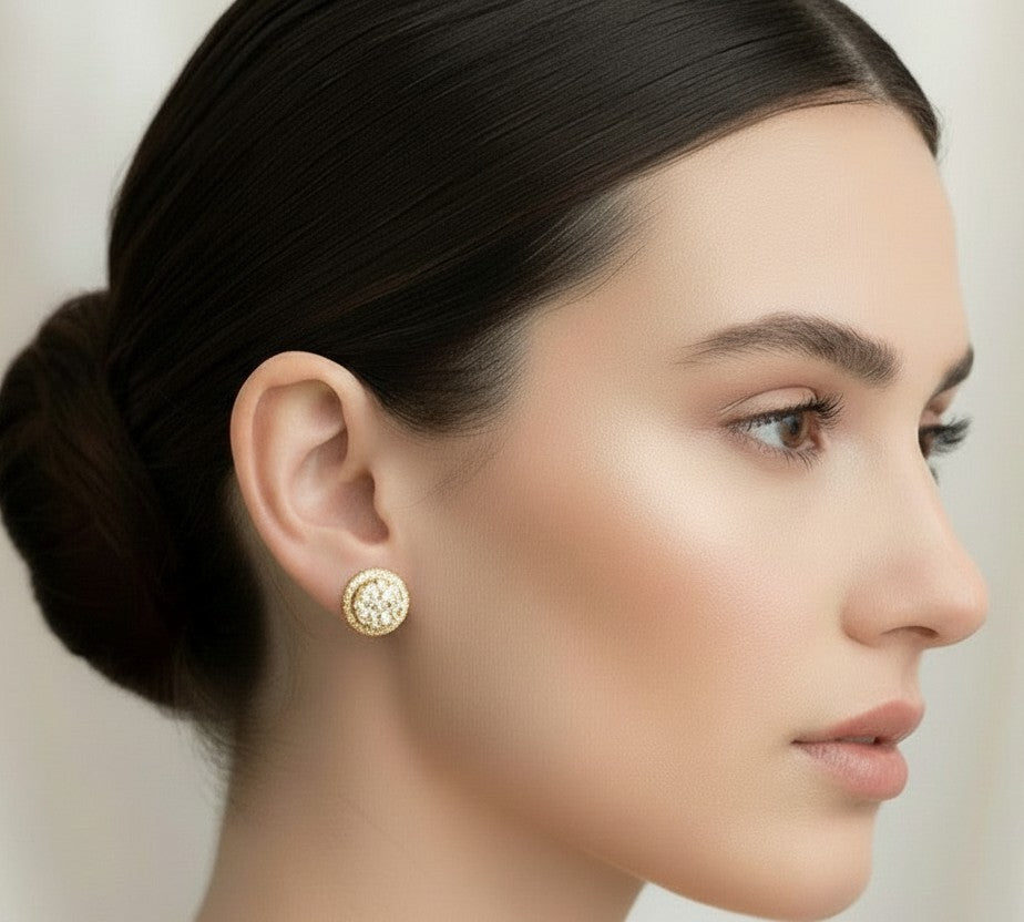 Elegant clip-on earrings featuring a compact 1/2" button design with a shimmering gold finish and sparkling clear stone clusters. Perfect for adding a touch of sophistication to any outfit without the need for pierced ears. The secure clip mechanism ensures comfortable all-day wear, while the timeless style makes these versatile pieces ideal for both everyday elegance and special occasions.