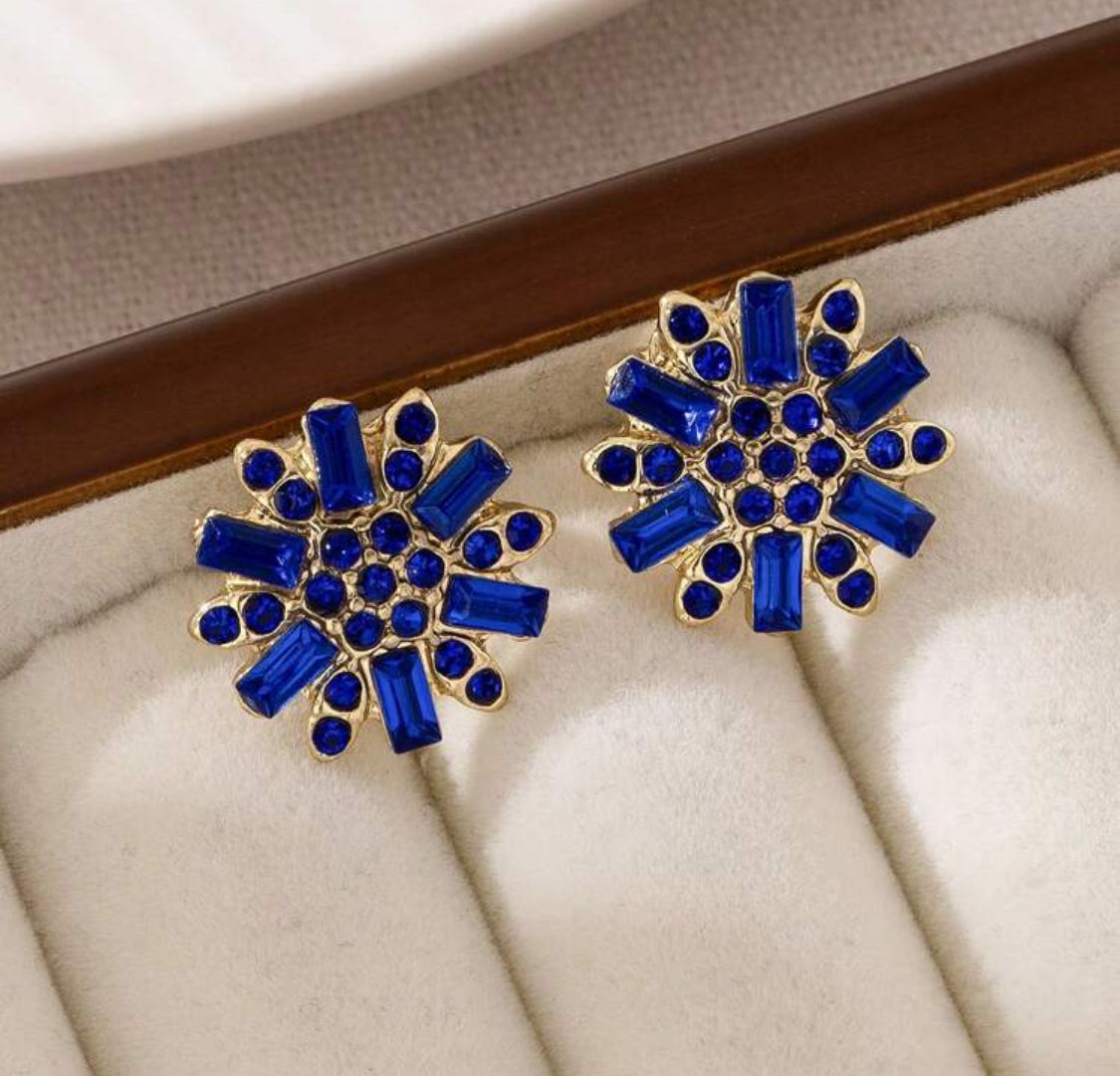 These elegant clip-on earrings feature a striking combination of gold with blue small square and round stones, measuring 3/4" for a perfect balance of boldness and subtlety. Designed for comfort without the need for pierced ears, they add a touch of sophistication to any outfit, making them ideal for both everyday wear and special occasions. Elevate your style