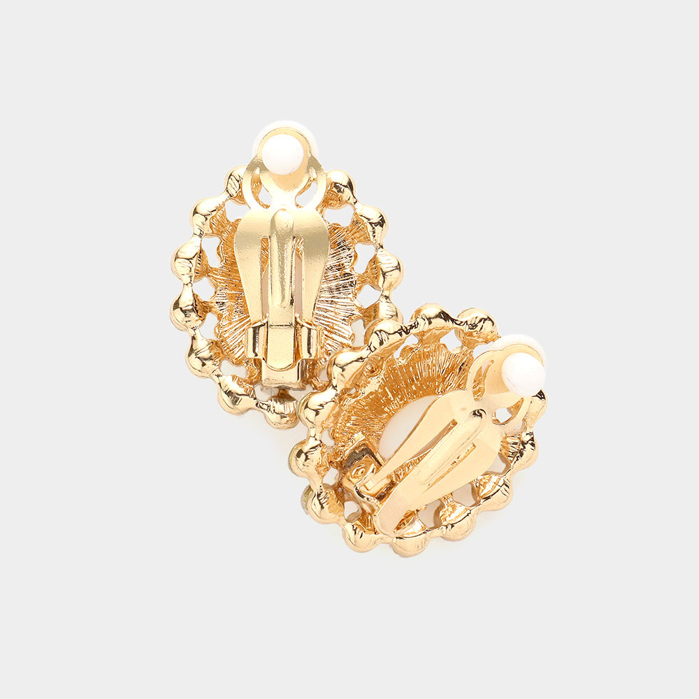 Add a touch of vintage elegance to your outfit with our clip on gold and cream pearl oval pendant necklace and earring set. The pendant and earrings feature clear stones for added glamour. The necklace is 16" with a 3 1/2" extender, while the earrings measure 1 1/4". Lead and Nickel compliant for your peace of mind.