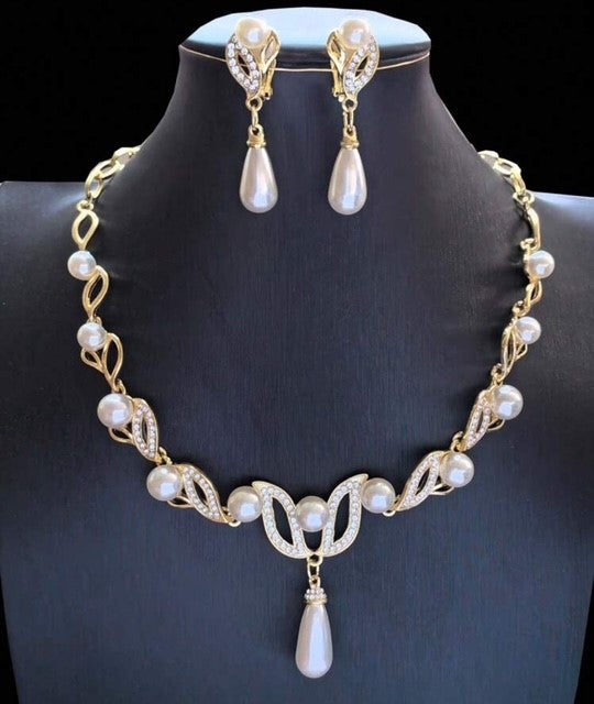 Step back in time with this stunning vintage clip-on gold vine necklace and earring set. Adorned with clear stones and white pearls, this jewelry set will add a touch of elegance to any outfit. Feel like a true vintage beauty with this classic and timeless set!