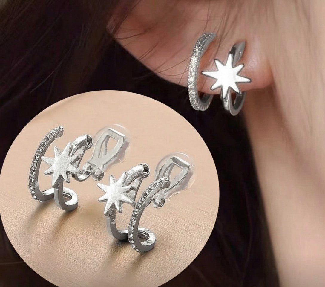 These striking silver clip-on hoops showcase a double-row design adorned with sparkling clear stones and a solid star, creating dimensional light-catching appeal. Measuring 1/2" for a refined, wearable scale, they combine celestial-inspired geometry with timeless hoop styling. The secure clip fastening accommodates all ear types while delivering polished sophistication.