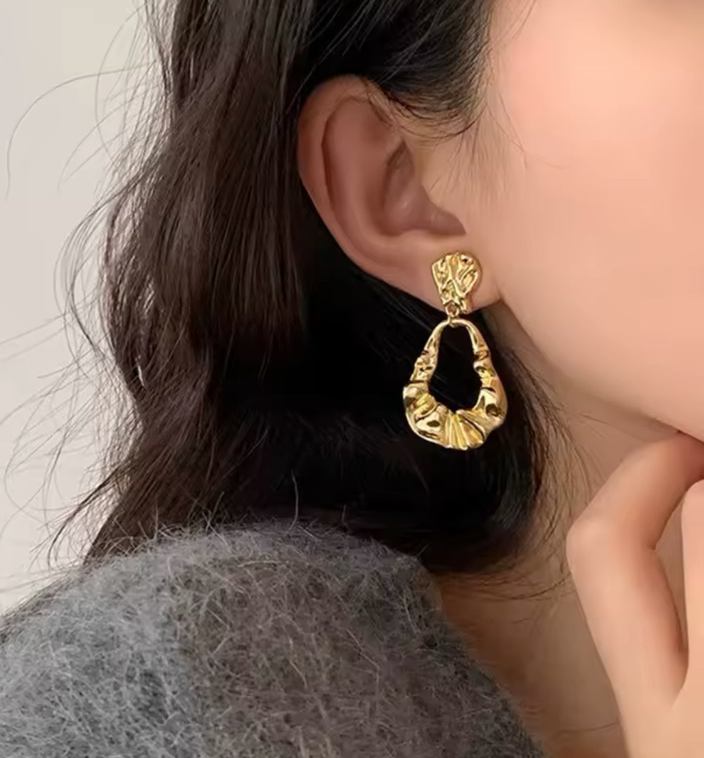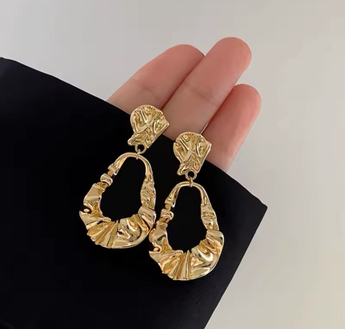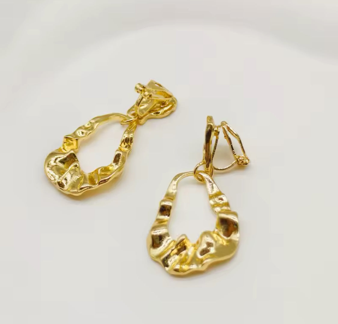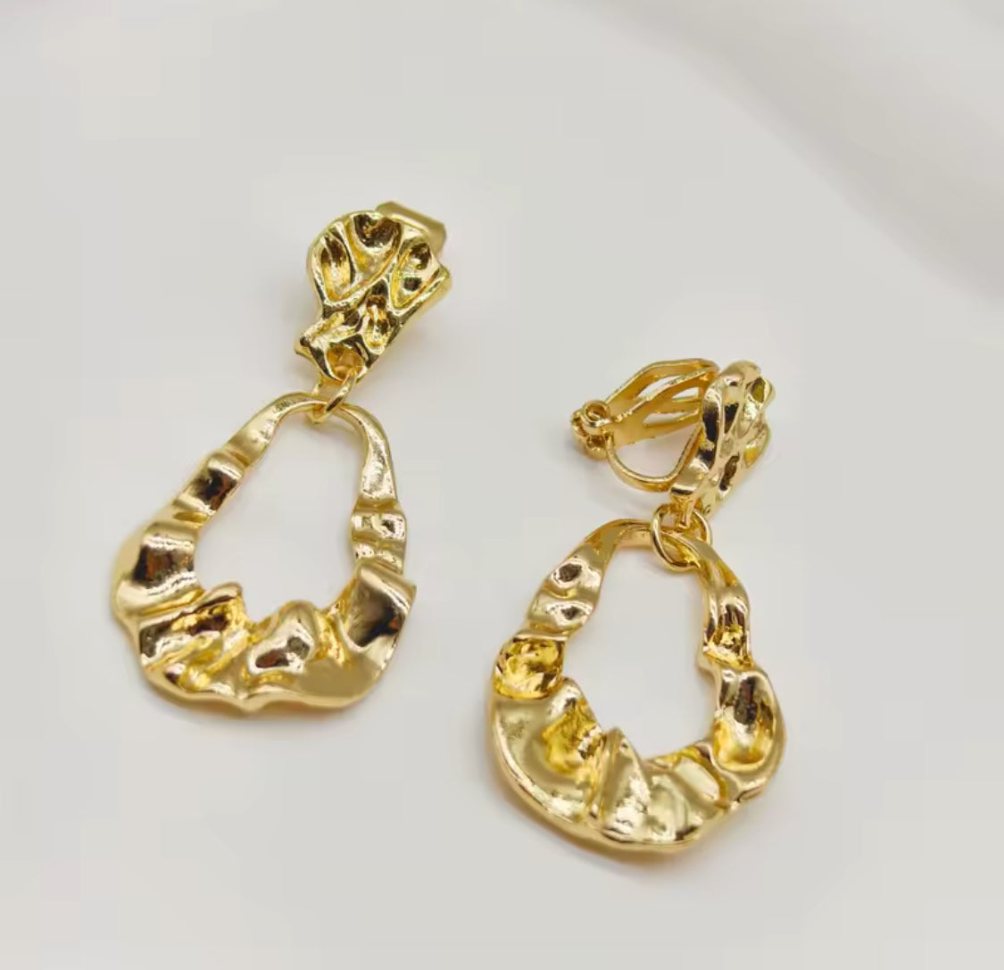 Elevate your everyday look with these unique clip-on earrings! The 1 3/4" gold hoops are adorned with a wrinkle texture and an unconventional shape, adding a touch of edge to any outfit. No pierced ears? No problem! These earrings clip on effortlessly for a comfortable and stylish fit.