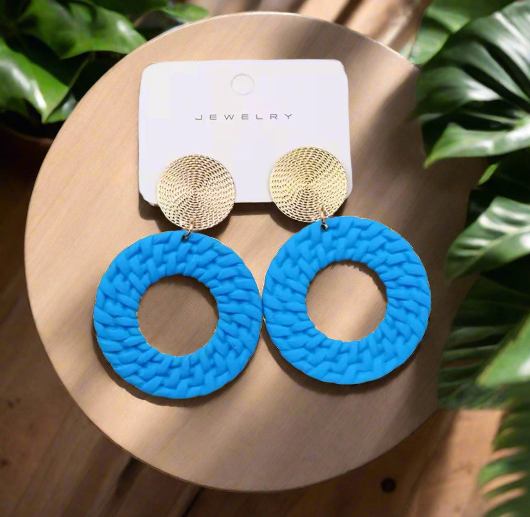 Elevate your style with our beautifully crafted clip-on 2 1/2" round gold top earrings. The elegant blue woven hoop adds a touch of sophistication to any outfit. No need for pierced ears, these clip-ons offer comfort and style in one.