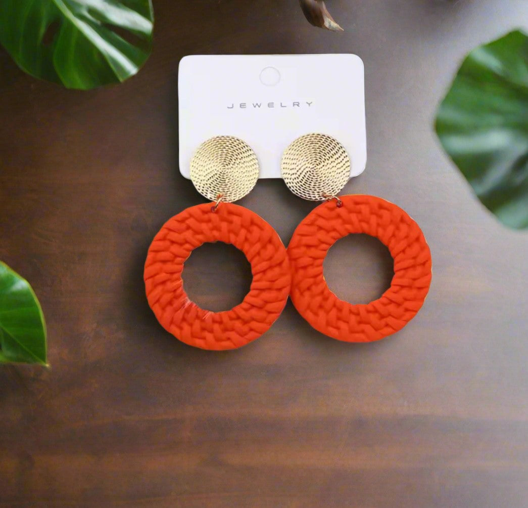 Elevate your style with our beautifully crafted clip-on 2 1/2" round gold top earrings. The elegant orange woven hoop adds a touch of sophistication to any outfit. No need for pierced ears, these clip-ons offer comfort and style in one.