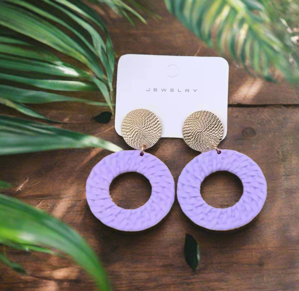 Elevate your style with our beautifully crafted clip-on 2 1/2" round gold top earrings. The elegant purple woven hoop adds a touch of sophistication to any outfit. No need for pierced ears, these clip-ons offer comfort and style in one.