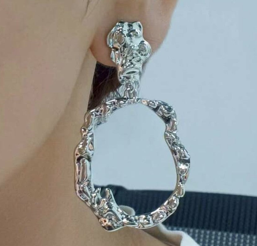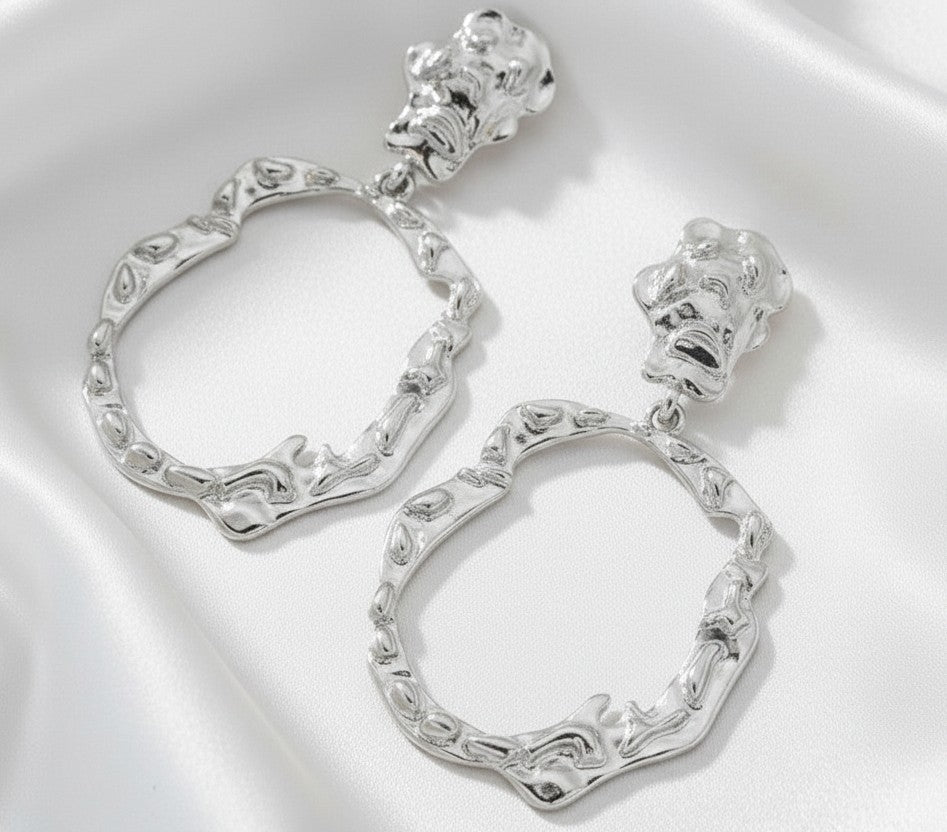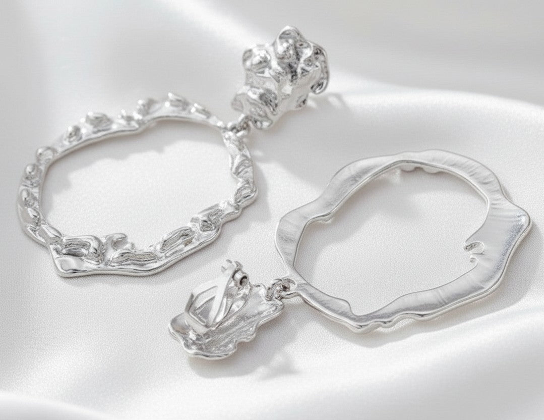 Elevate your accessory game with these striking clip-on dangle hoop earrings. Featuring a unique hammered texture and asymmetrical design, these 2 1/2" silver beauties make a bold statement without commitment. Perfect for sensitive ears or anyone who prefers clip-on styles, they deliver eye-catching style with an artistic, modern edge.