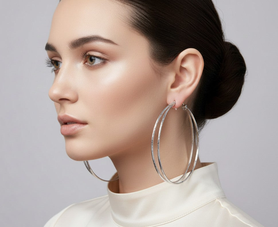 Make a bold statement with these striking silver XL clip-on hoop earrings. Featuring an eye-catching block print design wrapped around twisted open-back hoops, these 3 1/4" beauties deliver maximum impact without the commitment of pierced ears.