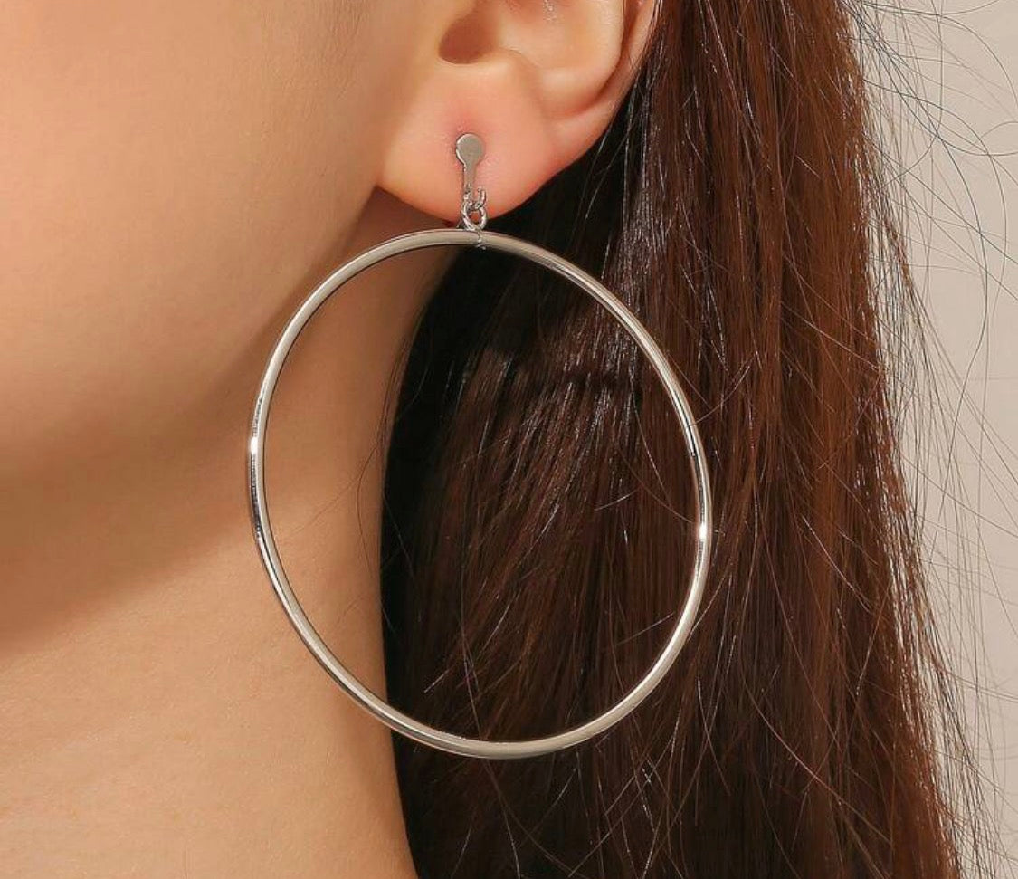 Clip on 3" large silver dangle hoop earrings with small clasp