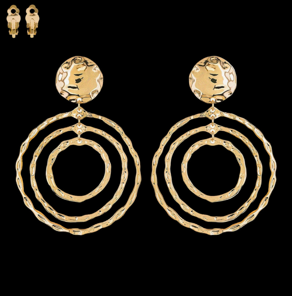 Make a bold statement with these 3 1/2" extra-large gold hammered multi hoop dangle earrings. Their unique hammered texture catches the light beautifully, adding a touch of elegance and edge to any outfit. Designed as clip-ons, they offer all the style without the need for pierced ears, making them an ideal accessory for effortless glamour. Perfect for elevating your look, these earrings combine eye-catching size with lightweight