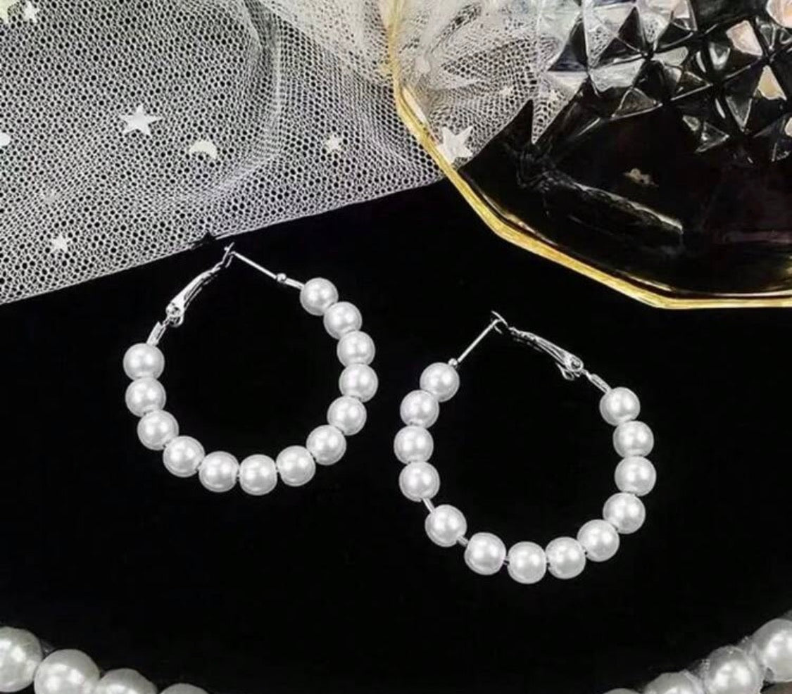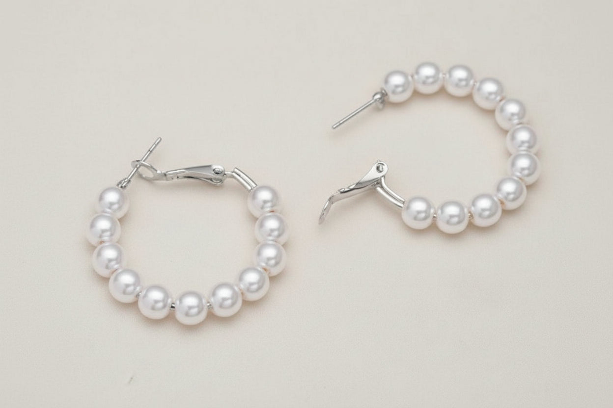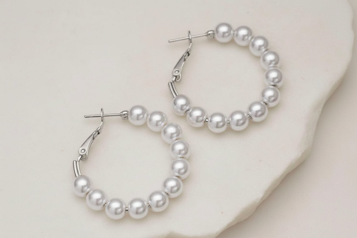 Elevate your everyday look with these stunning 1 1/2" hoop earrings, where lustrous white pearls meet warm silver tones for a timeless combination. The perfect balance of sophistication and versatility, these pierced earrings transition seamlessly from office to evening, adding an instant touch of elegance to any outfit.