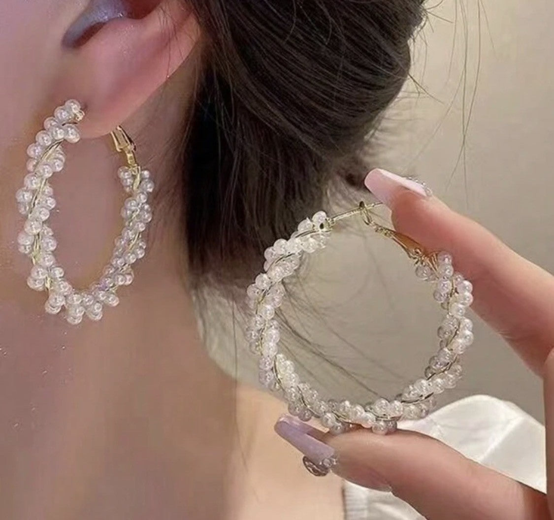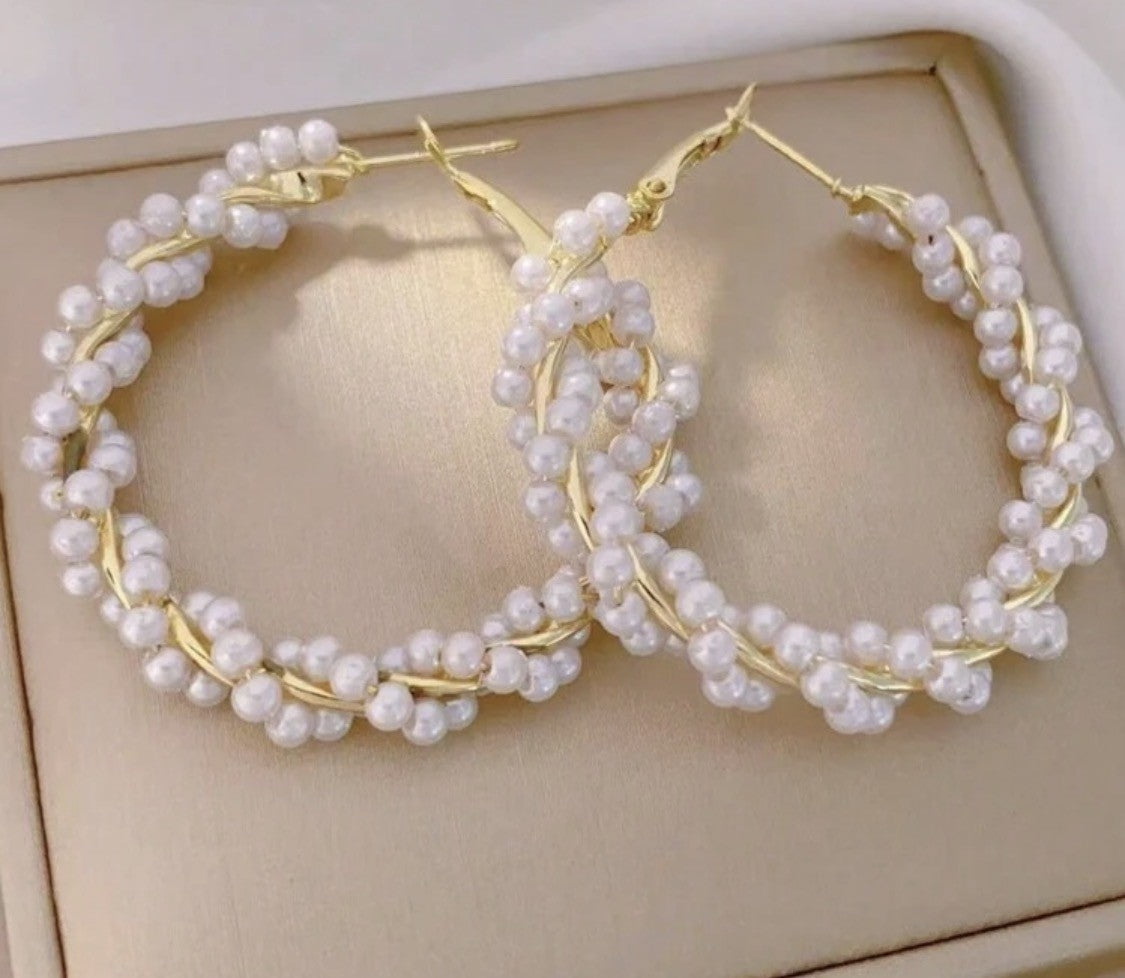 Pierced 2" gold wire and small pearl twisted hoop earrings
